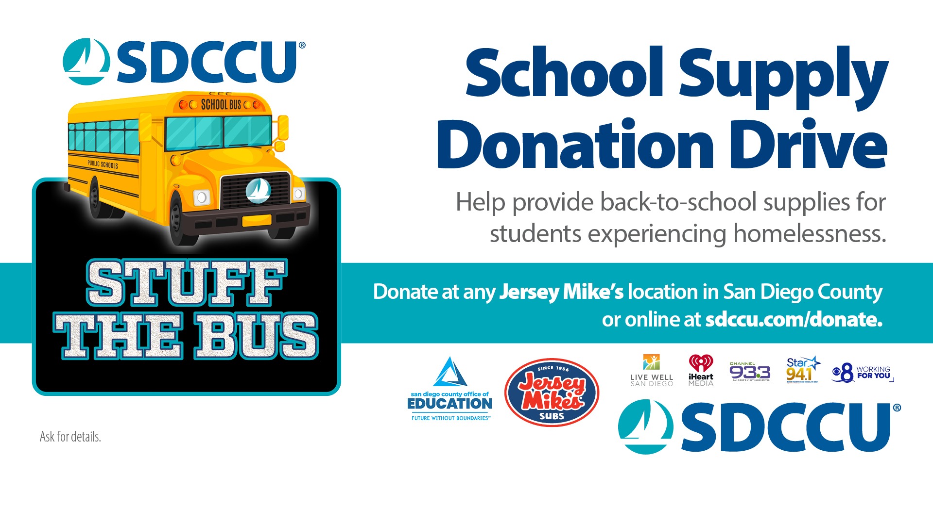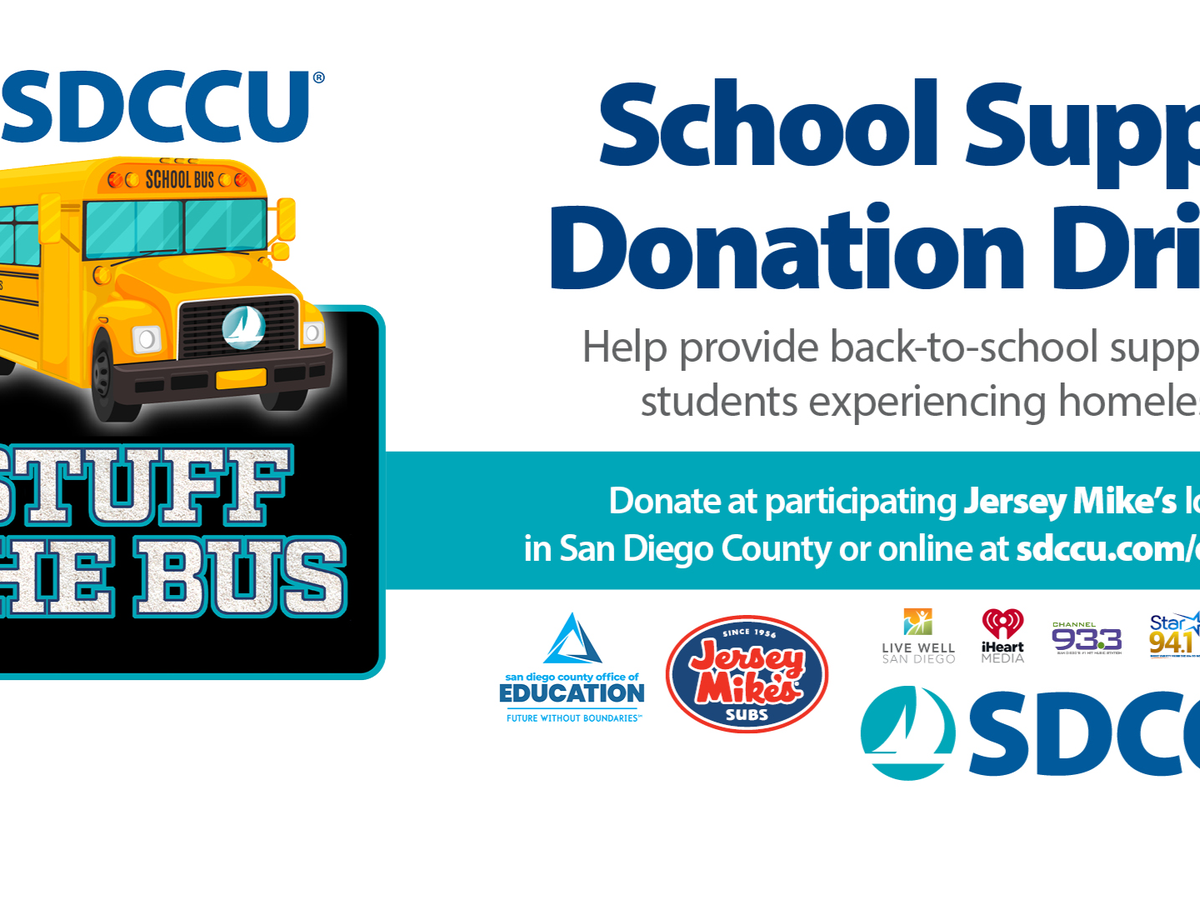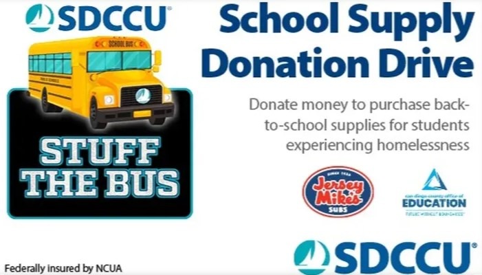 During the last school year, more than 23,000 children were identified as experiencing homelessness in San Diego County. SDCCU is partnering with the San Diego County Office of Education to collect monetary donations to purchase back-to-school supplies for local students in need. Students and families have many needs and school supplies shouldn't be one of them. Help fill the SDCCU virtual school bus with our local iHeart Media radio stations and Jersey Mike's in San Diego County now through July 31. And let's make sure students have what they need to start school just like all their friends this year.