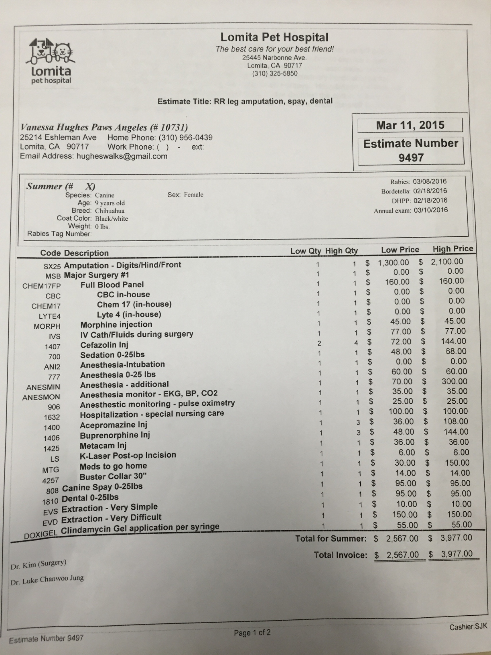 Summer appears to have been hit by a car long ago & left untreated. She was brought into a high kill Los Angeles shelter as a stray in mid-February. She was microchipped & her nails were painted red, but her family never came to pick her up. She was rescued in mid-March by Paws Angeles Animal Rescue. She is friendly, loving, affectionate, happy & easy going. She needs surgery to have her leg amputated, her teeth cleaned & to be spayed so that she can move forward with her life & find her furever family. The estimate is for $2567 - $3977. Any little bit helps! Please consider donating a few dollars. You can also call Lomita Pet Hospital directly at (310) [phone redacted] & leave a donation under Vanessa Hughes / Paws Angeles.