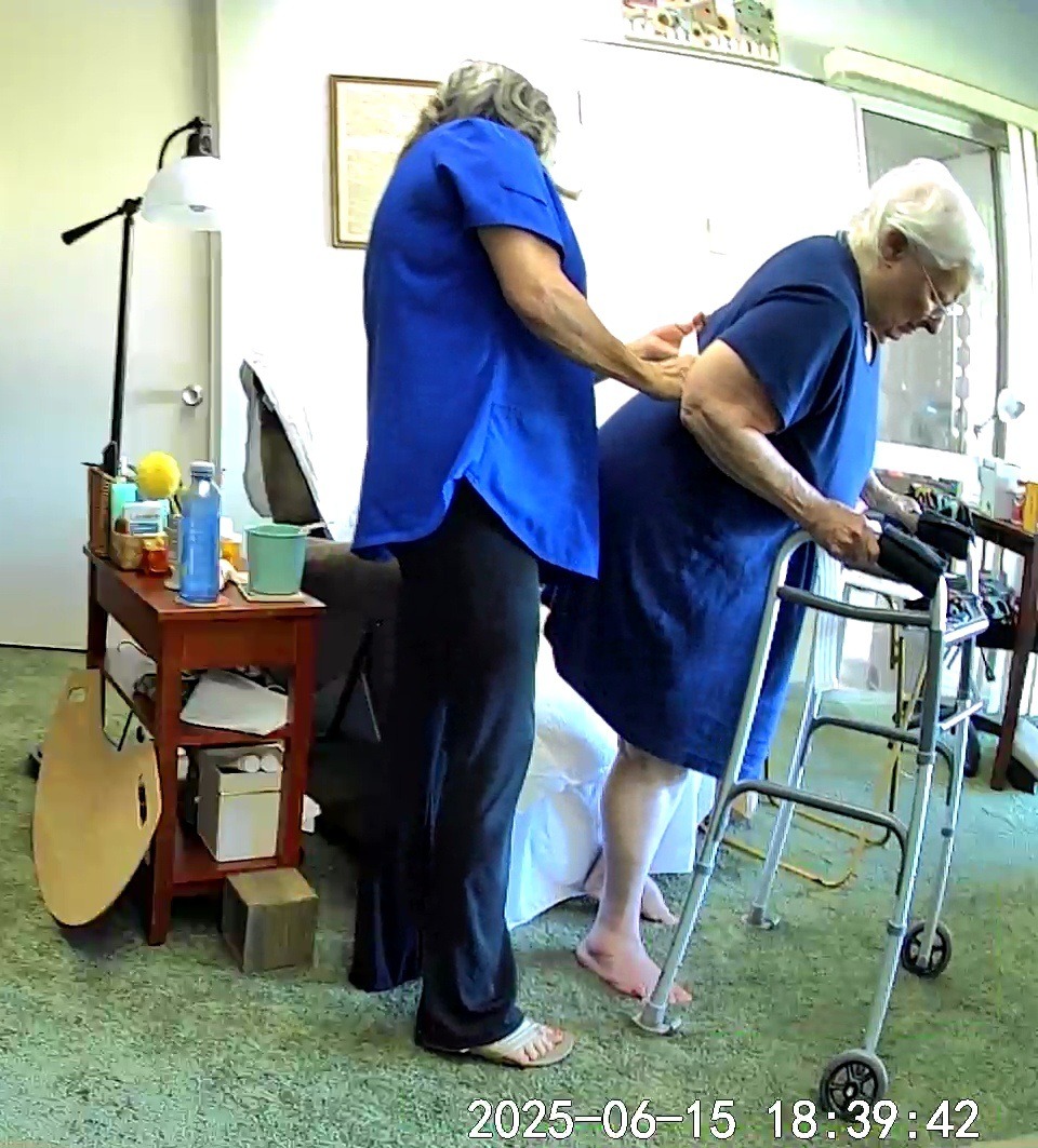 Daily caregivers must fully assist in her bathroom duties, along with doing her clothing changes, laundry, weekly sponge baths, and meals.