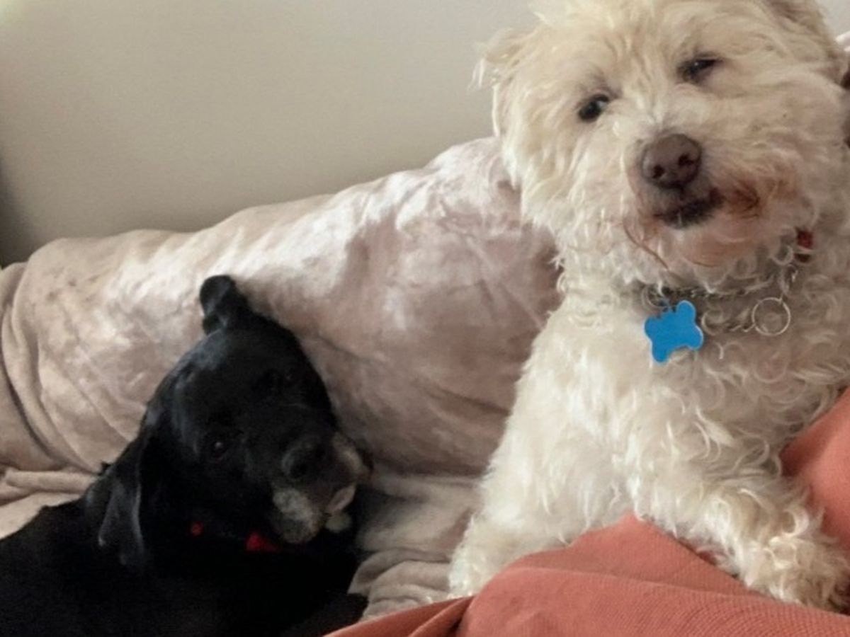 A little about Abby and Sparky: Abby is a 10 year old Pit-Lab-Boxer mix who is full of wisdom and radiates calm. She has a great appetite and is a loyal walking companion. Sparky is a 12 year old white ball of fur who is a playful and protective snugglebug. He also has a great appetite : )