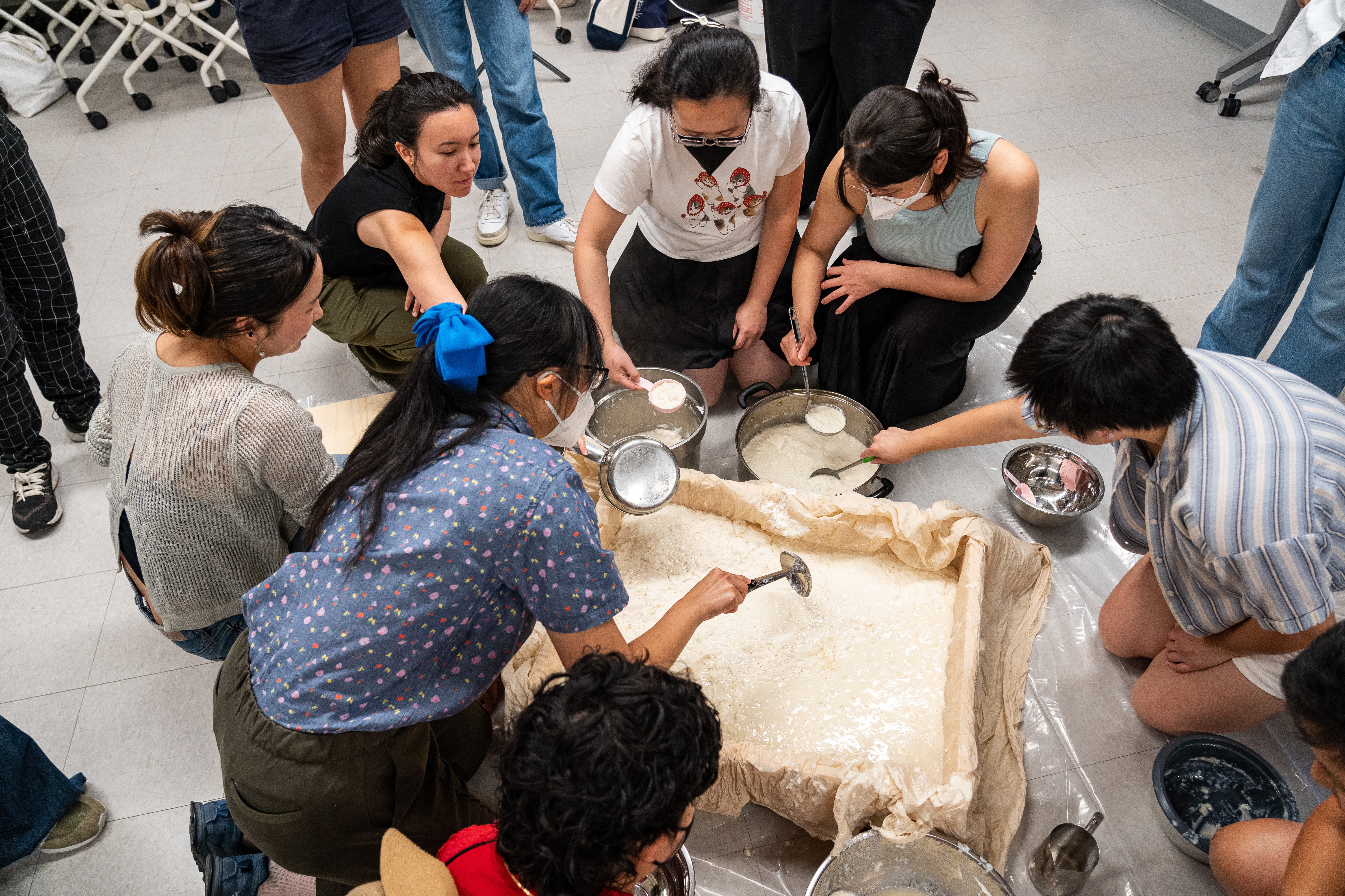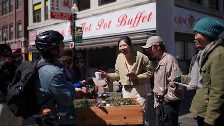 As a cultural worker and woman artist, I create art that foster connection, collective joy, and cross-cultural understanding and racial, economic, and food justice in art and labor. I focus on making art accessible by moving beyond traditional galleries and into everyday public spaces. Much of my work takes place outside of galleries—rooted instead in public spaces and everyday encounters. Whether it’s in my family’s restaurant, inside an elevator where I moved a couch to invite intimate conversations in a shared space, or on the streets of Boston’s Chinatown where I handed out soybean sprouts from my tofu tricycle to pedestrians, I strive to transform ordinary environments into spaces of reflection and fun social gathering/idea to connect people or bring people together. My installations and performances have appeared in unexpected places: school entrances, residential and business building, street pop up installation and performance, community green spaces,