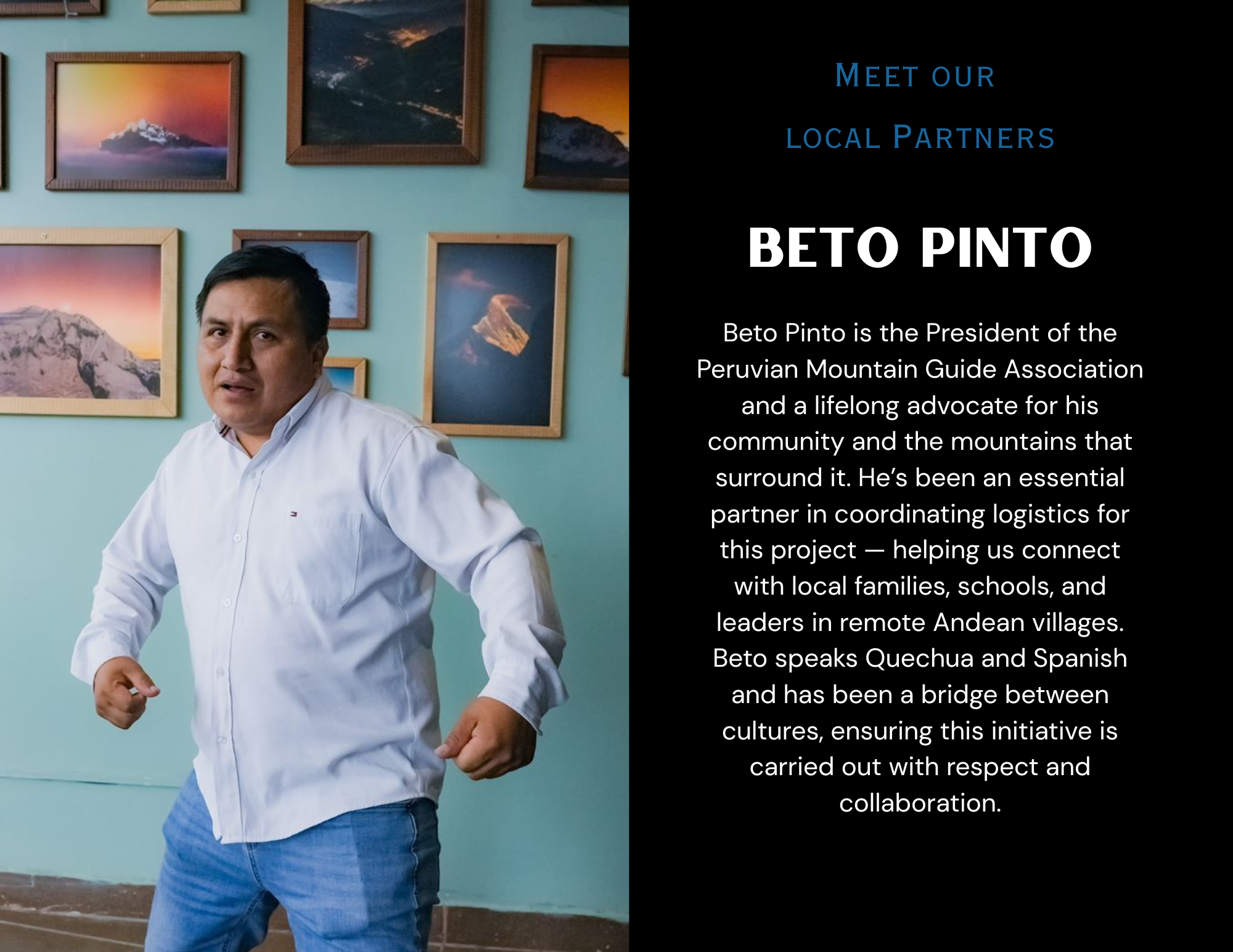 Beto Pinto, President of the Mountain Guide Association of Peru, is coordinating with local communities, and Drs. Delicia and Rafael Hurtado will help ensure the project is carried out responsibly.