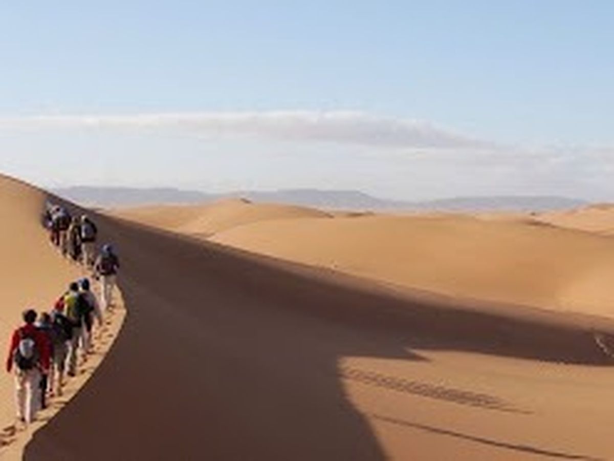 This five day trek covers over 100km passing through peaks, gorges, dunes and oases. The trek is between 20-25km per day and the terrain is incredibly varied with some days being hard, rocky and flat with others taking on rolling sand dunes which can be very hot and hard going given the temperature at this time of year ranges from 25-35 degrees.