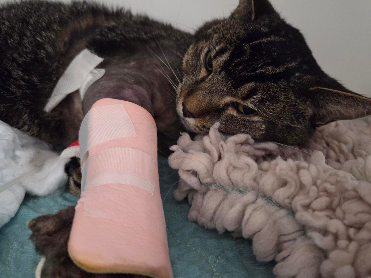 Meow, my name is Trouble. Just a short time ago I was found on the roadside after being hit by a car. My back leg was badly infected and rotten, and my front paw was badly damaged. I had been hiding in pain, waiting for help for over a week. A kind lady took me to the emergency vet and saved my life.