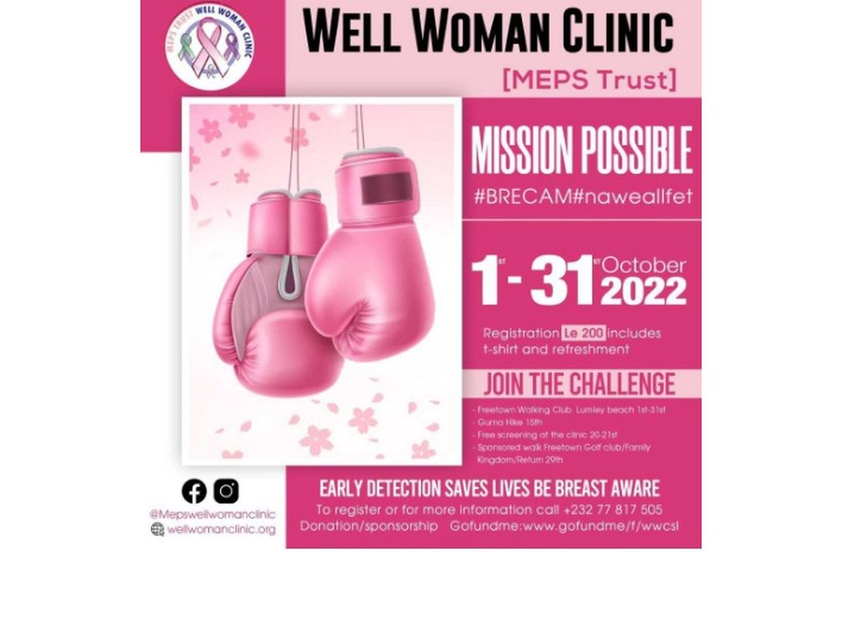 This year’s challenge is titled Well Woman Clinic #BRECAM 2022 #MissionPossible # NaWeAllFet. We encourage participants to join us by registering your activity throughout October and donating proceeds to the clinic. Registration cost is Le200,000. You will receive a t-shirt and a refreshment at registration.