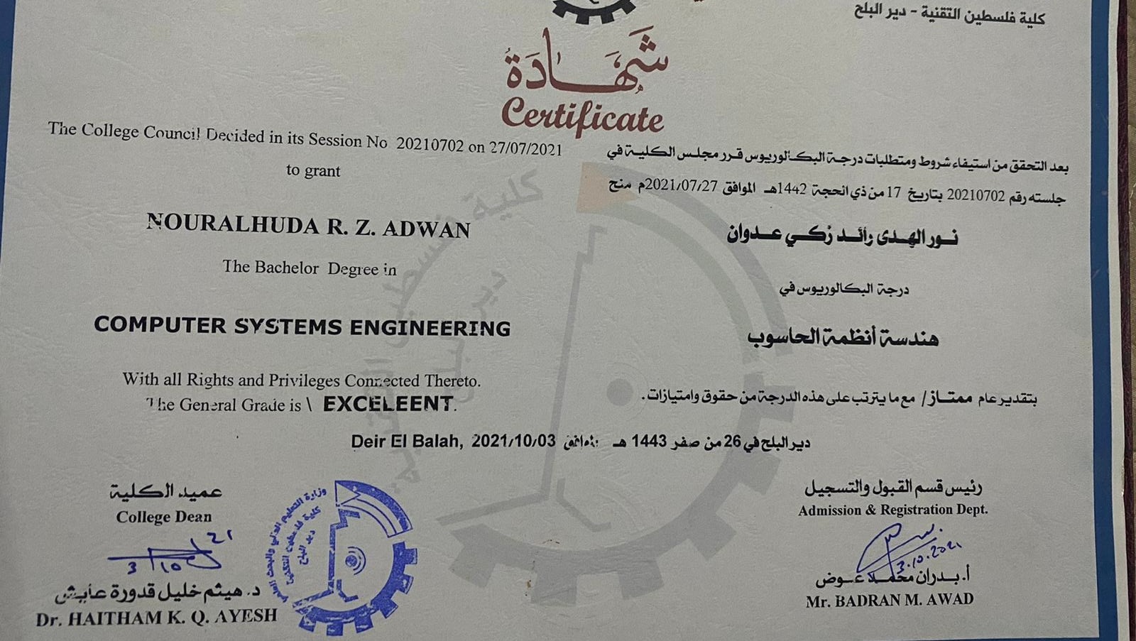 My name is Nour Adwan, and I am 26 years old, and I live in Palestine, specifically in the Gaza Strip. I write to you today with a heart full of hope despite all the pain and difficult circumstances my family and I are facing. I graduated from the College of Engineering with a degree in Computer Systems Engineering, earning an excellent GPA and ranking first in my class. I worked in iOS application development and pursued my passions in areas such as programming and drawing, like any girl striving to achieve her dreams in this world.