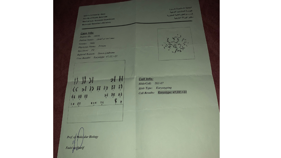 - One month before the war broke out, we were blessed with our first child, whom we named Mohammed. Our joy was indescribable as he came into our lives to fill them with happiness. However, the doctor informed us that Mohammed might be a child with Down syndrome. We searched for a lab capable of conducting the necessary tests and found that the Islamic University lab was the only one available. After a month of waiting, just a few days before the war began, we received the results confirming that Mohammed is indeed a child with Down syndrome—what we like to call “a child of happiness.” We accepted this news with faith and gratitude, and I prayed to God to grant me the strength and ability to provide Mohammed with a dignified life and to help him develop his potential so he can live happily and thrive, just as he deserves.