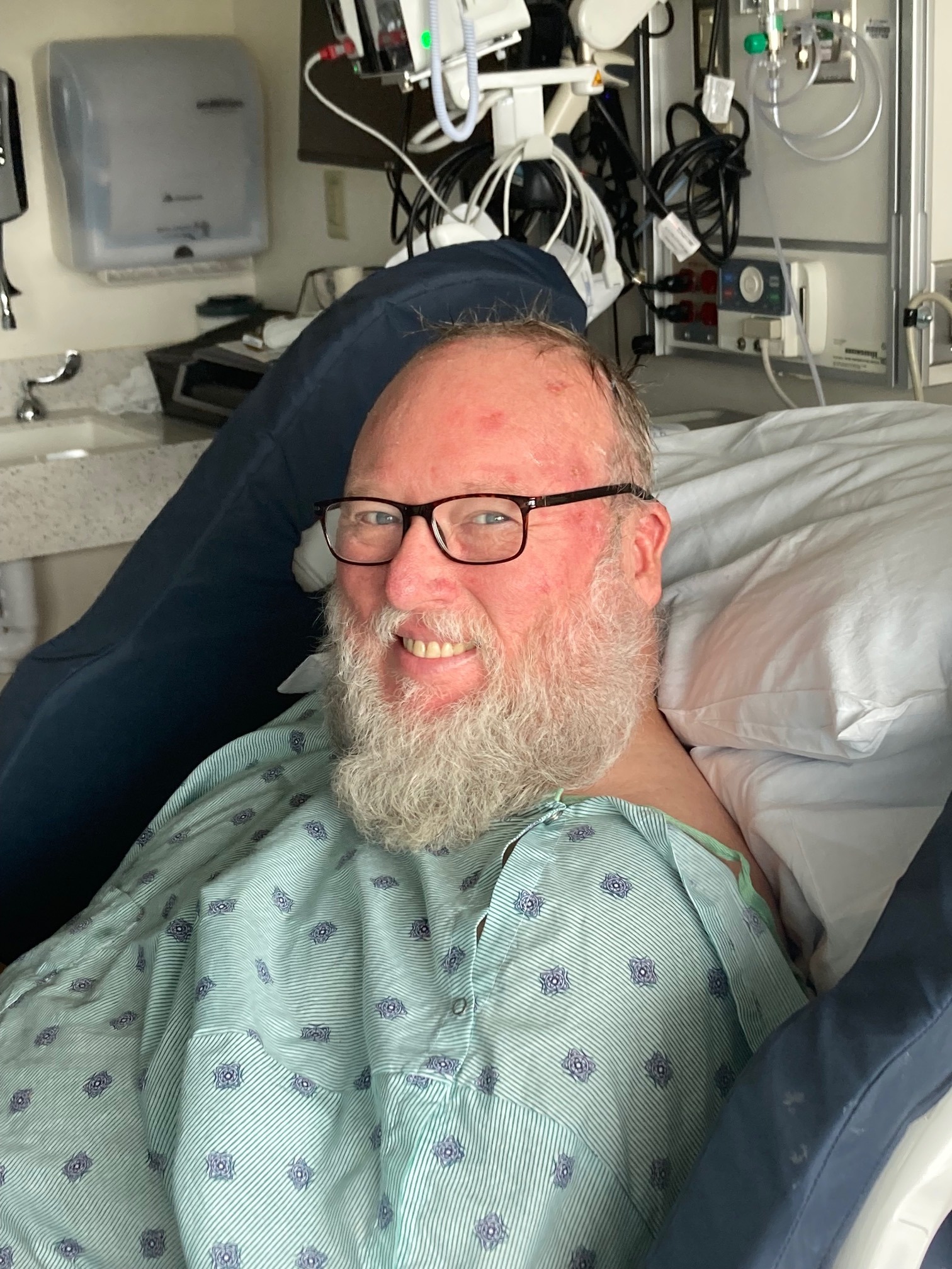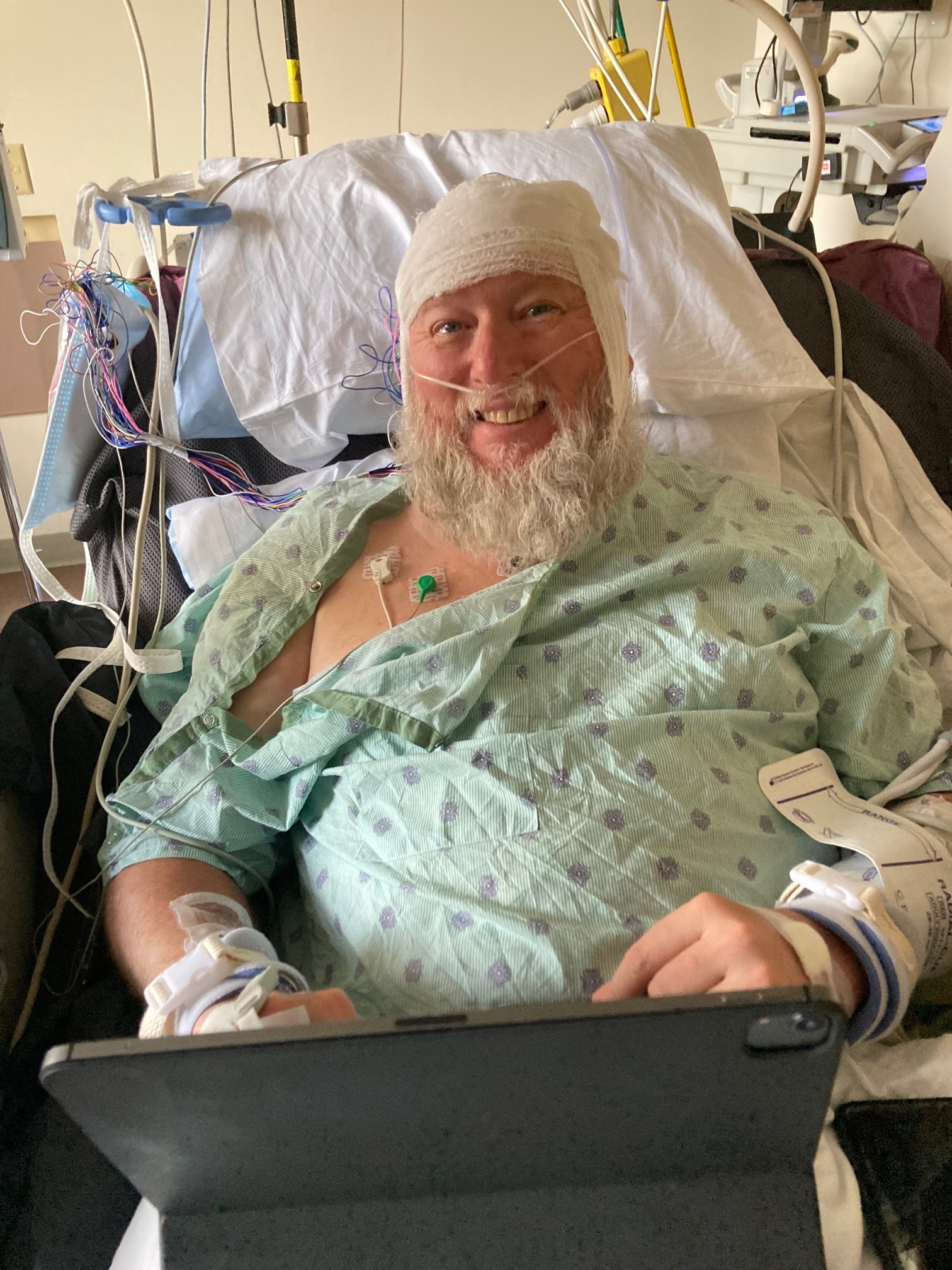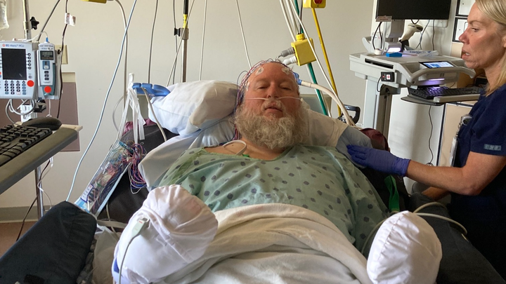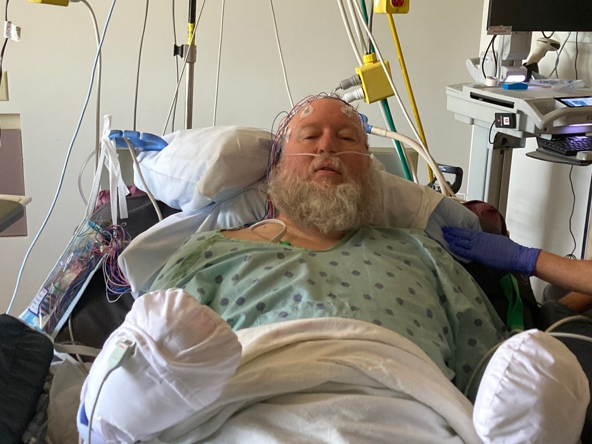 The days that followed were a waking nightmare. Kirk's first seizure, a "tonic-clonic" episode, was controlled with a single medication, but even after he was sent home, his speech was still confused. Dana would ask him if he knew who she was, and he would nod and answer, "Seven." It was clear something was still terribly wrong. Then at home a few days later, he had another seizure, followed almost immediately by several more. Dana and their son, Alec, called 911, where he was rushed to St. Vincent Hospital and admitted to the Neural Critical Care Unit. For several days, Kirk was in a constant battle with his own body, enduring back-to-back seizures that wouldn't stop.