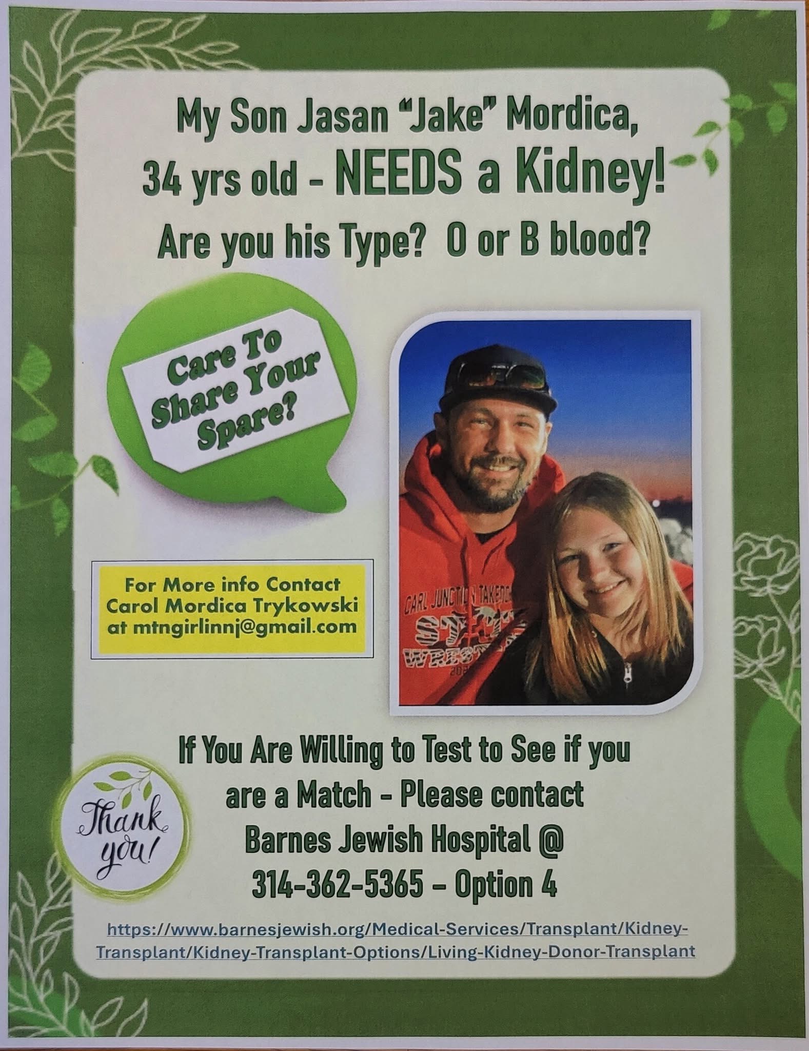 As most of you know, Jake is needing a kidney. The post I made had 198 shares, so I'm hopeful this will go far and wide.