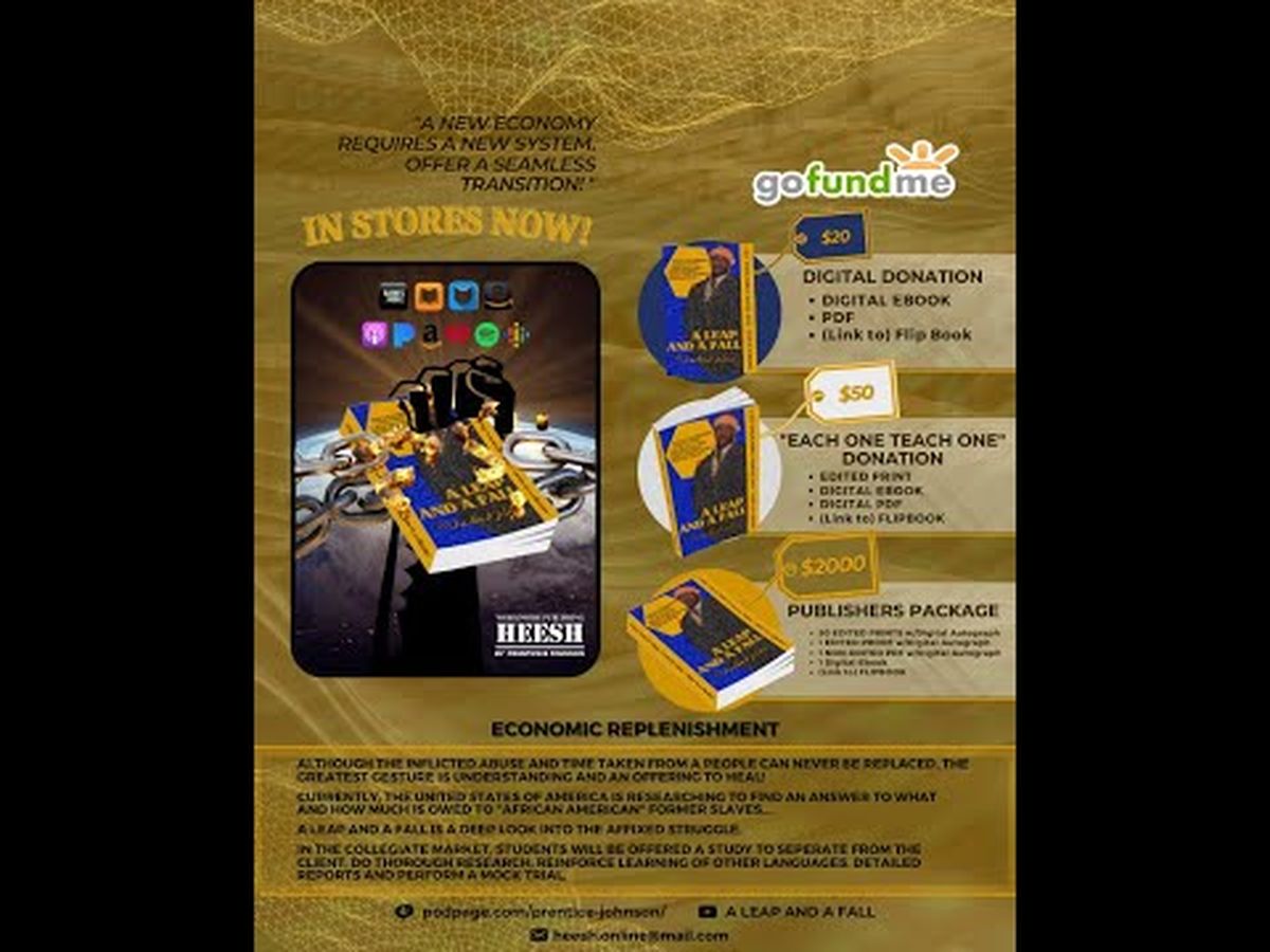 Granting reparations, Prentice believes the United States economic system must be able to pay itself back. To accomplish this, Prentice is offering the book A Leap and a Fall to the colleges for 25 years of mandatory study.