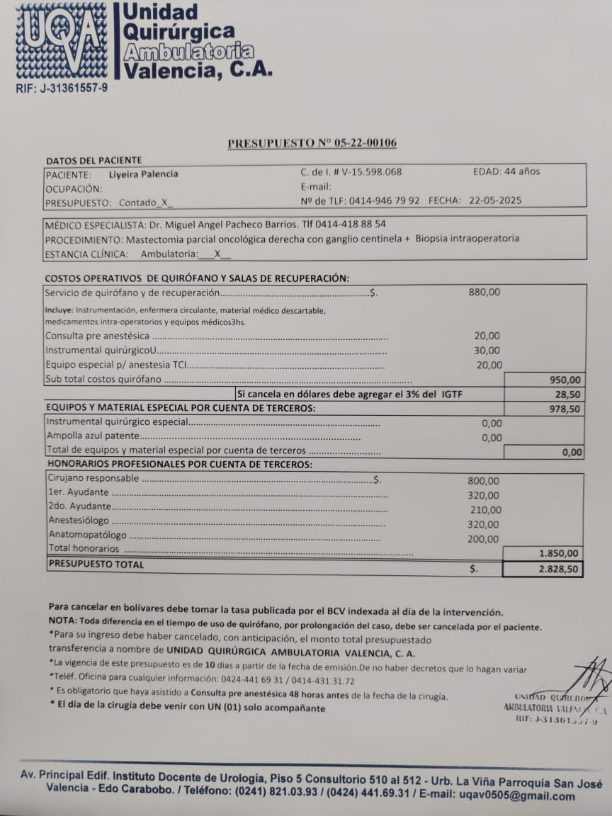Hola, mi nombre es Liyeira Palencia, una madre soltera luchadora con el corazón lleno de amor por mis hijos, Johana Valentina y Aldemaro José. Hoy me enfrento a uno de los desafíos más difíciles de mi vida: cáncer de seno. Necesito urgentemente someterme a una Mastectomía Parcial Oncológica Derecha con Ganglio Centinela y Biopsia Intraoperatoria para poder seguir adelante y mantenerme fuerte por mis hijos.