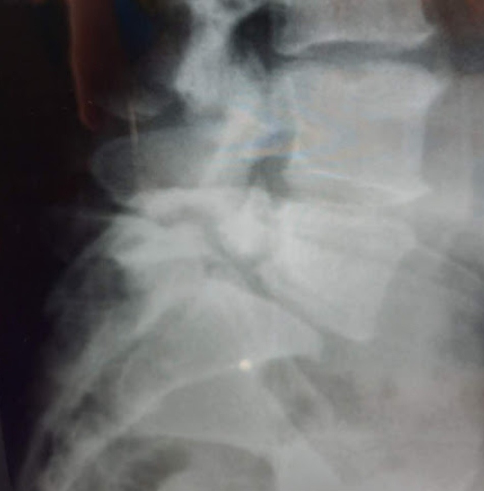 After identifying the right L5 neuroforamen, the C-arm was rotated to a right lateral oblique angle. Lidocaine 1% was used to anesthetize the skin at a skin entry site coaxial with the fluoroscopy beam, and overriding the superior aspect of the neuroforamen. A 5 inch 22 gauge spinal needle was advanced under intermittent fluoroscopy until it entered the foramen superiorly.