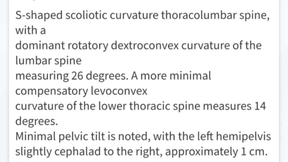 Scoliosis Location: thoracic, and lumbar (dominant) regions.