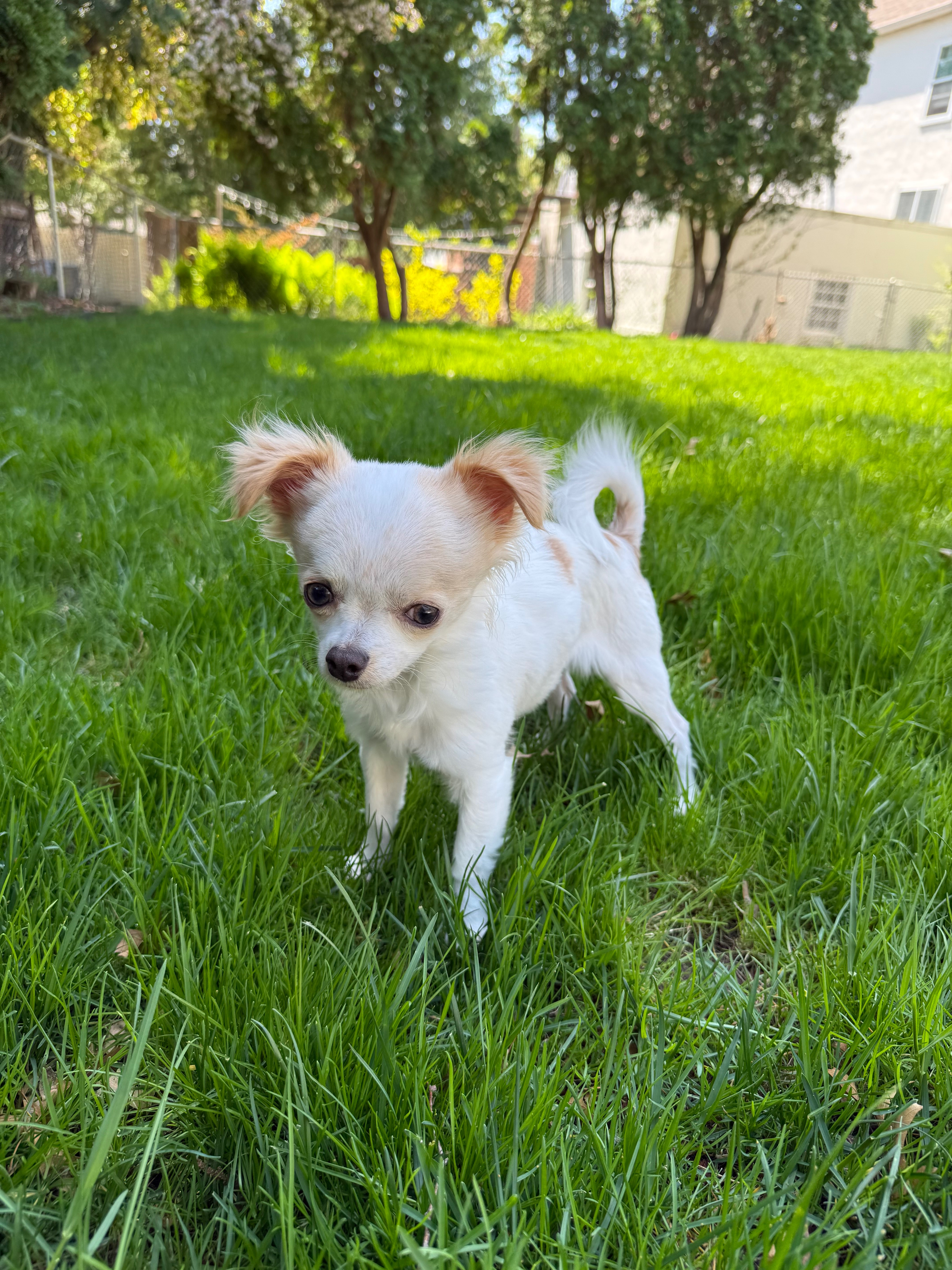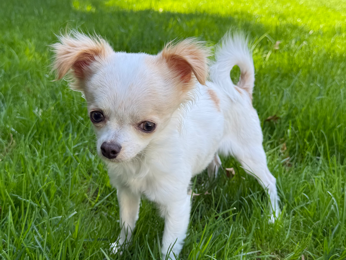 Hi! I’m Noah. I’m a 7-months old, 4-pound chihuahua mix. I was born at Barefoot Crow Animal Rescue in Wisconsin after my biological mom was sent to live there by a breeder. It was fun living with llamas and goats, but I was so excited when I got to experience my first car ride to my forever home. During that ride, my mom confessed she knew I was the one because I reminded her of my angel sister, Leah. “Sweet and spunky,” she said.