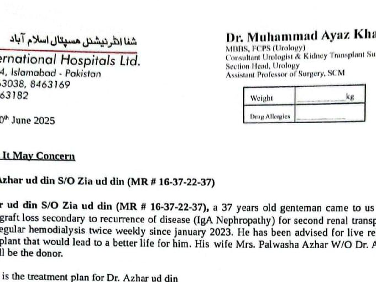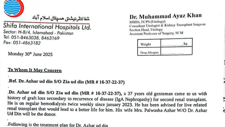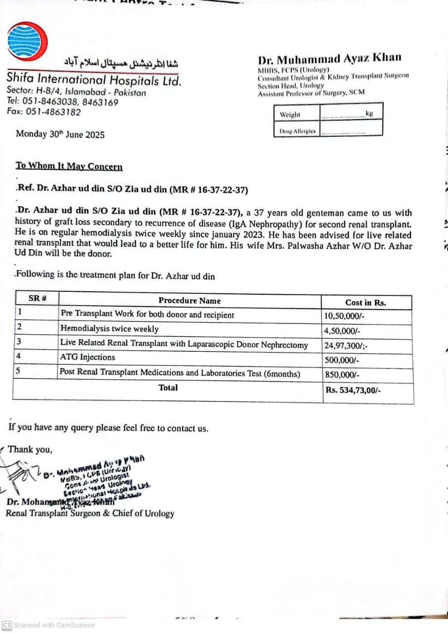 Dr. Azhar has been advised to undergo a live related kidney transplant at Shifa International Hospital in Islamabad. His brave wife has stepped forward to donate her kidney. The only obstacle now is cost.
