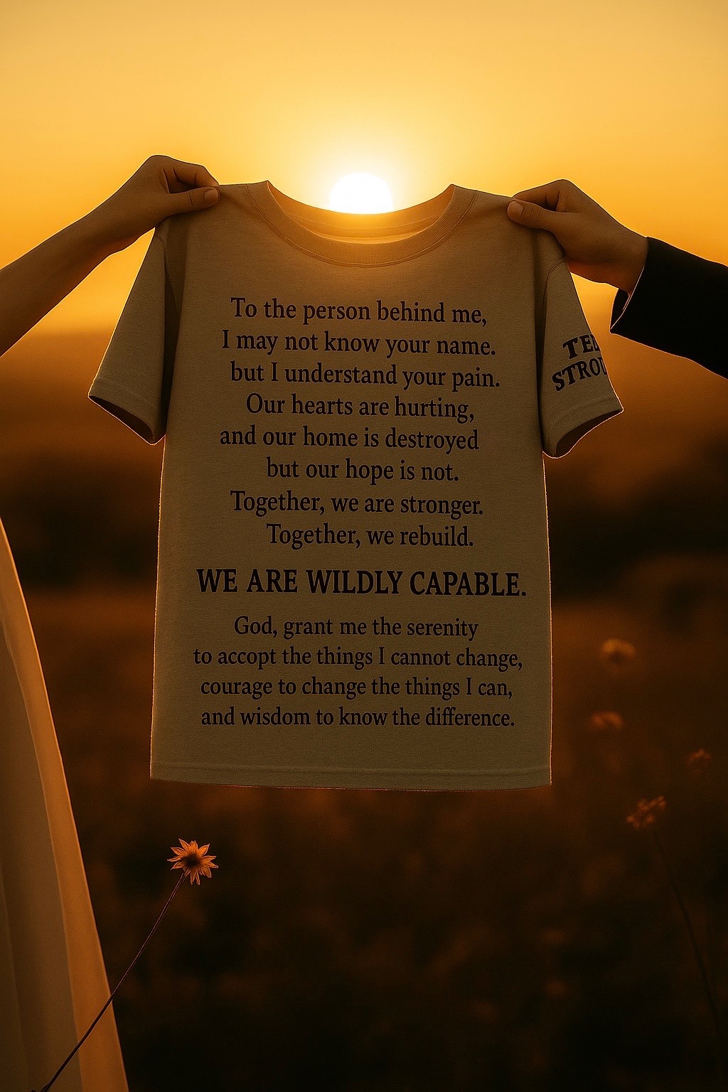 The shirts also carry the Serenity Prayer - a quiet reminder of strength, acceptance, and courage that many will need in the days to come.