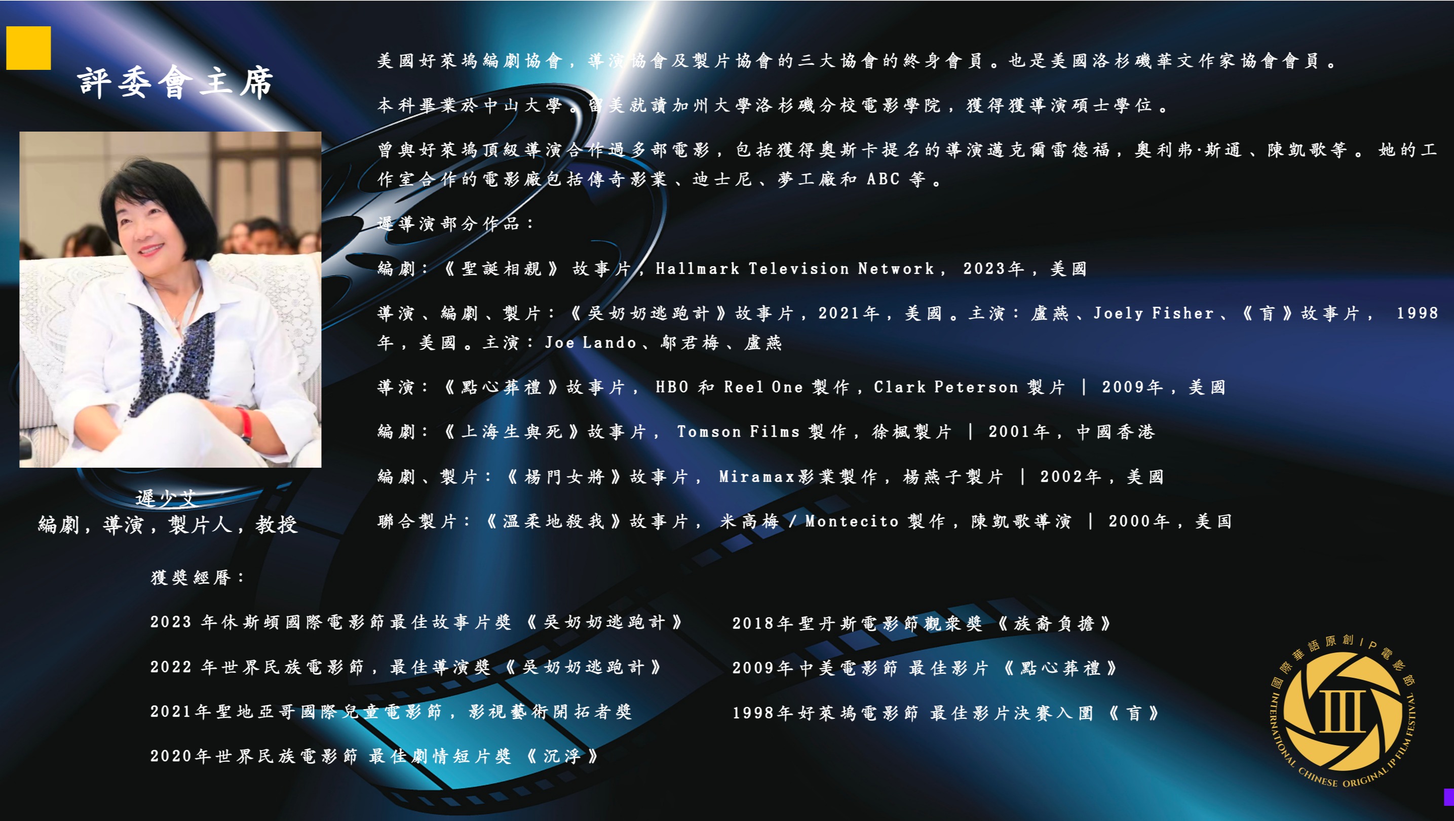 She currently serves as the chairperson of the American Overseas Writers Association and the executive director of the 4th International Chinese Original IP Film Festival in Los Angeles in 2026. (WeChat:americanmm)