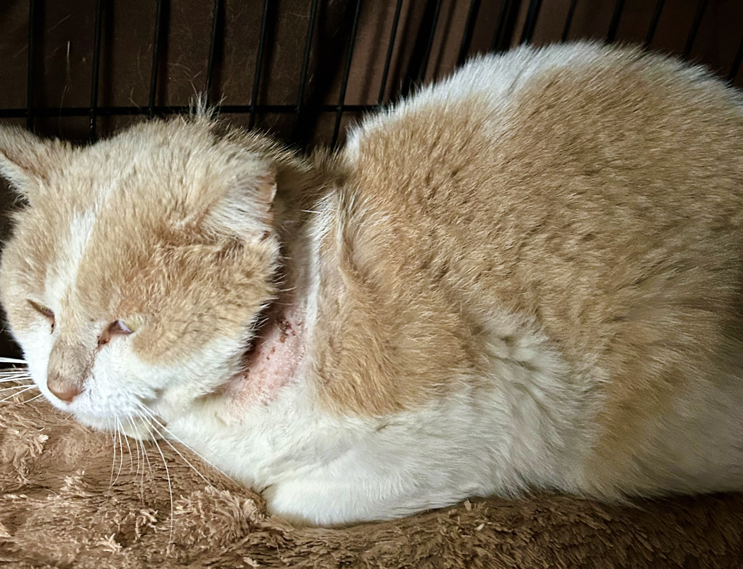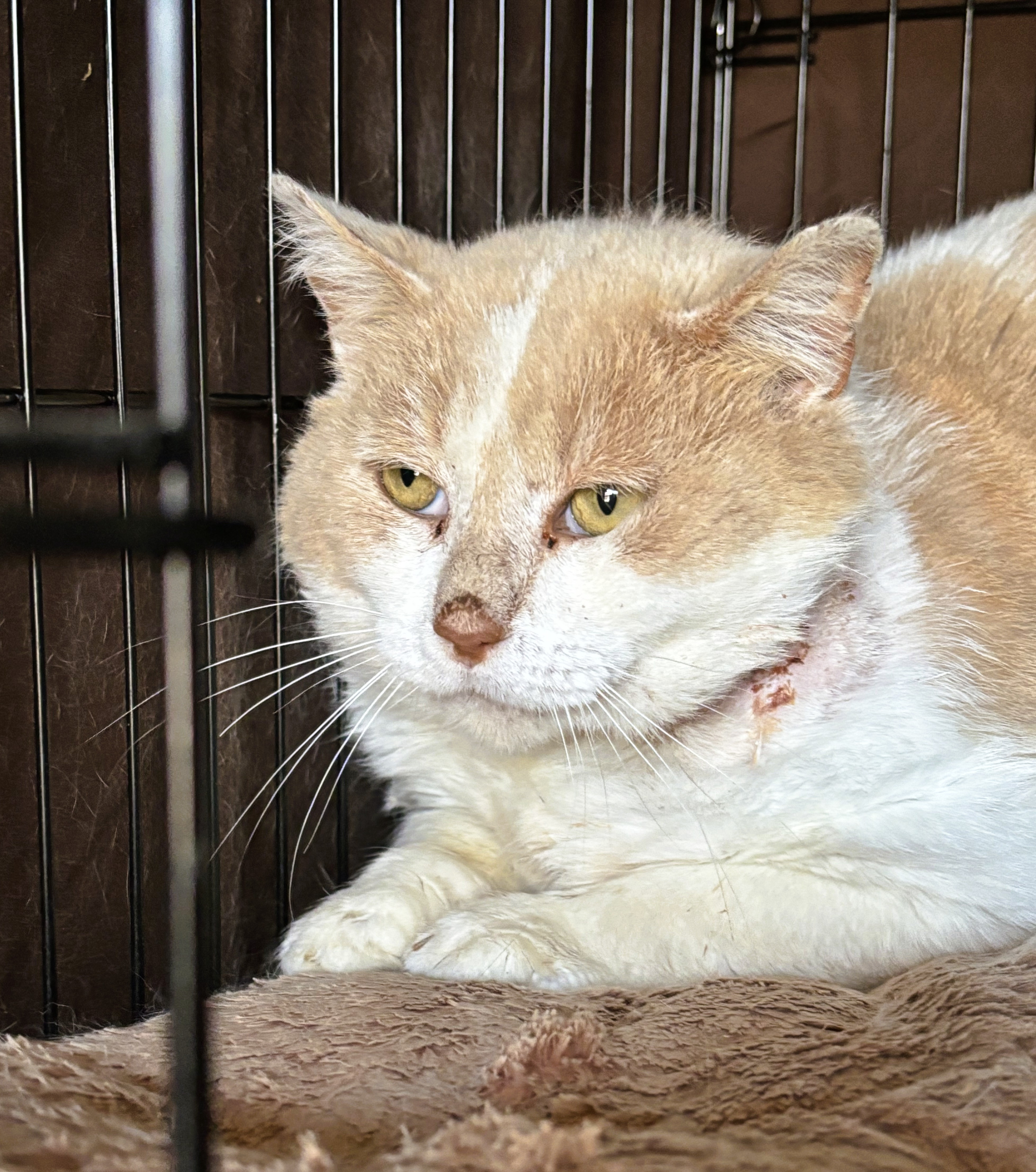 Humphrey is a recent rescue brought in after being found with a severe neck injury and a painful infection. He's a semi-feral male; we think he had a human family early on until he found himself homeless. He is approximately 4-5 years old, and he is understandably very scared after everything he's been through. In addition to his neck wounds, Humphrey is suffering from serious dental issues that will require urgent veterinary care. Despite his fear, the team is doing everything possible to make him comfortable and begin the healing process. He is already making great progress!