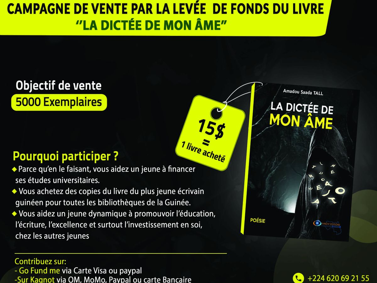 Dans ce présent projet de fundraising, mon objectif est de vendre 5000 exemplaires de mon livre avec un prix exceptionnel de 15 dollars USD par exemplaire au lieu de 10 euros, initialement prévu. Les bénéfices réalisés serviront à financer mon projet d’étude universitaire et les exemplaires achetés seront distribués dans toutes les bibliothèques de la Guinée.
