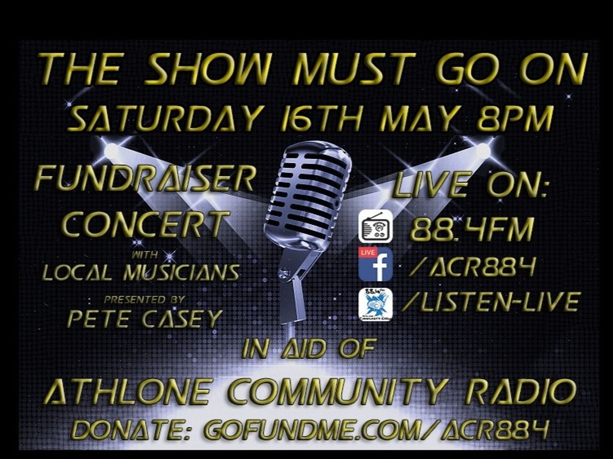 The Show Must Go On will broadcast live this Saturday May 16th at 8pm, you can listen on 88.4fm, online www.athlonecommunityradio.ie/listen-live , the tunein app, and on fb live www.facebook.com/acr884. The videos will also be available to view on Athlone Community Radio's facebook page.