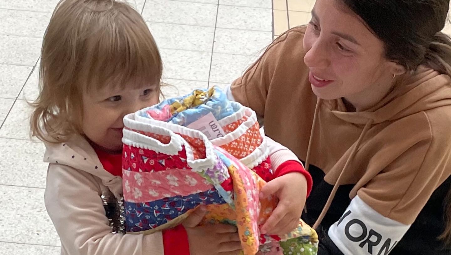 Hi! We are Gina and Beth, the worker bees behind Wrap the World With Quilts. We have been to Poland several times, visiting refugee centers and food kitchens, and distributing YOUR donated quilts to Ukrainian refugees. In the past year, we have collected over 26,000 quilts from all over the US. Most of those have already arrived in Poland and Ukraine. They are making a difference to each family and child that have received the quilts. We have seen the impact this gift of time, money, and talent can have on another person's life. It's amazing!