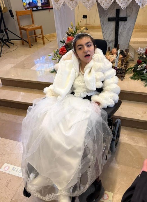 Sono la mamma di Angela Lucia, una bambina di 11 anni affetta dalla nascita da tetraparesi spastica distonica dovuta a una sofferenza neonatale. I nuclei della base del suo cervello sono calcificati e ha un ritardo psicomotorio dovuto proprio a questo problema.