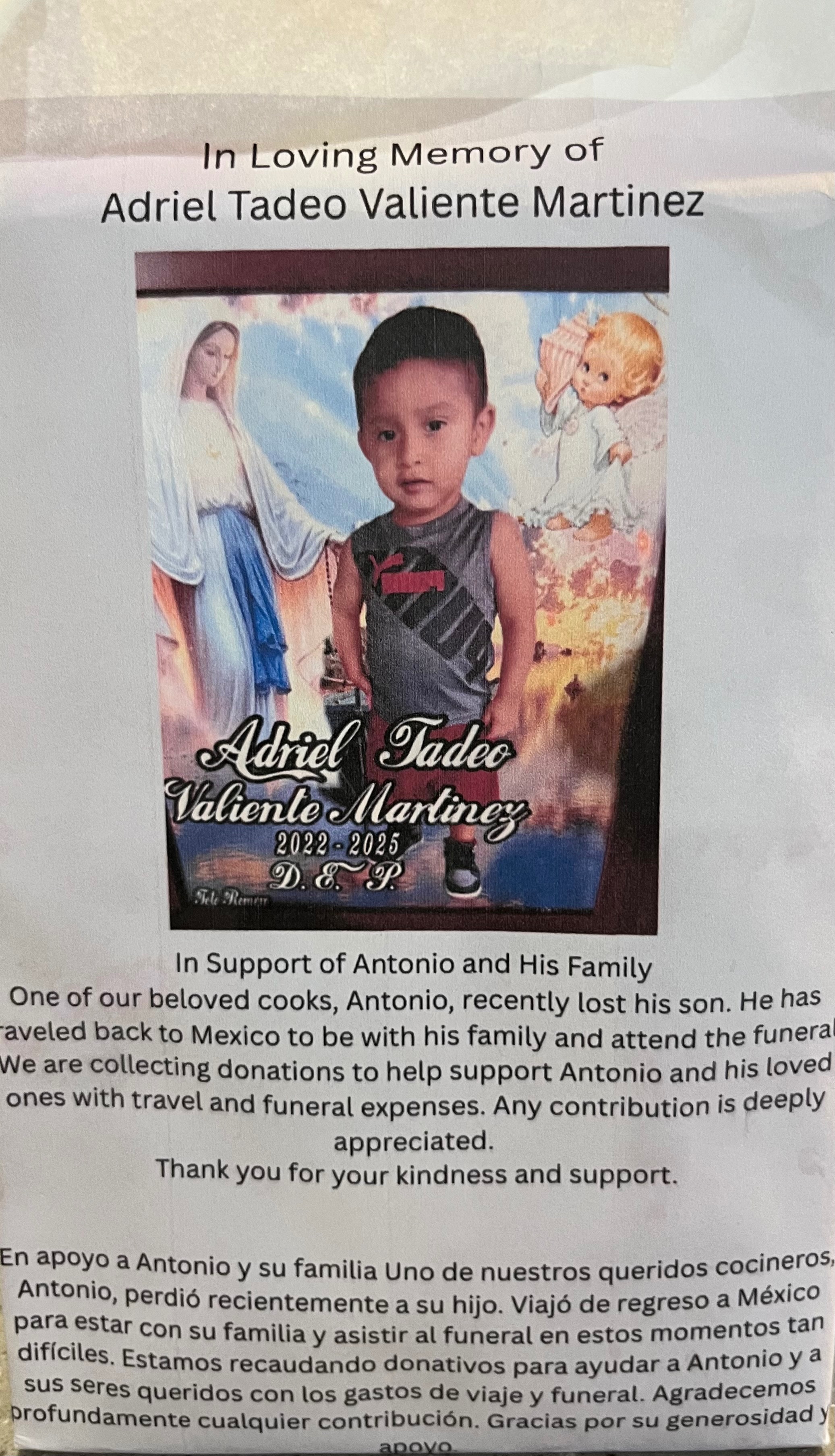 This is Adriel Tadeo . He was only 3 years old and diagnosed with Leukemia. It is a type of cancer that affects the blood & bone marrow . My uncle Antonio was a line cook at Dennys providing for his wife and family back in Mexico . No papers and only able to speak Spanish Antonio came to work in the U.S. around 1.5 years ago to afford the medical expenses and frequent hospital visits needed for Adriel. Sadly Adriel passed at 2 am in his sleep and my uncle Antonio has to return back to Mexico due to the circumstances . This is a sad and unfortunate time for our entire family . All proceeds will go to Antonio and his family to cover the travel / funeral service. Any type of contribution is appreciated. No father should outlive their son . Thank you for your kindness and support .