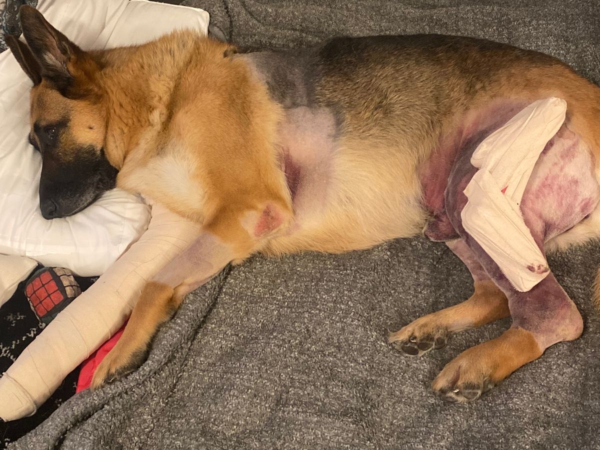 Hello our names are Rob, Jenn and Zofia. This is our sweet boy Bentley. I am reaching out on behalf of Bentley. He is a 5 year old German Shepard who was shot 3 times in front of our home on September 1st in an act of animal cruelty. He spent several nights and days at a animal hospital getting several blood transfusion, a exterior fixator on his rear hind leg and a casting on his front shattered limb. He also had a collapsed lung that has resolved itself already. He is finally home relaxing and trying to get himself back to normal. He has a very long road ahead and the unexpected veterinarian bills are starting to pile up. Even though he is considered a animal he is a very large part of our family. We are asking for prayers for his healing and if you are able to contribute to help Bentley in his recovery effort our family would be very appreciative. God bless!