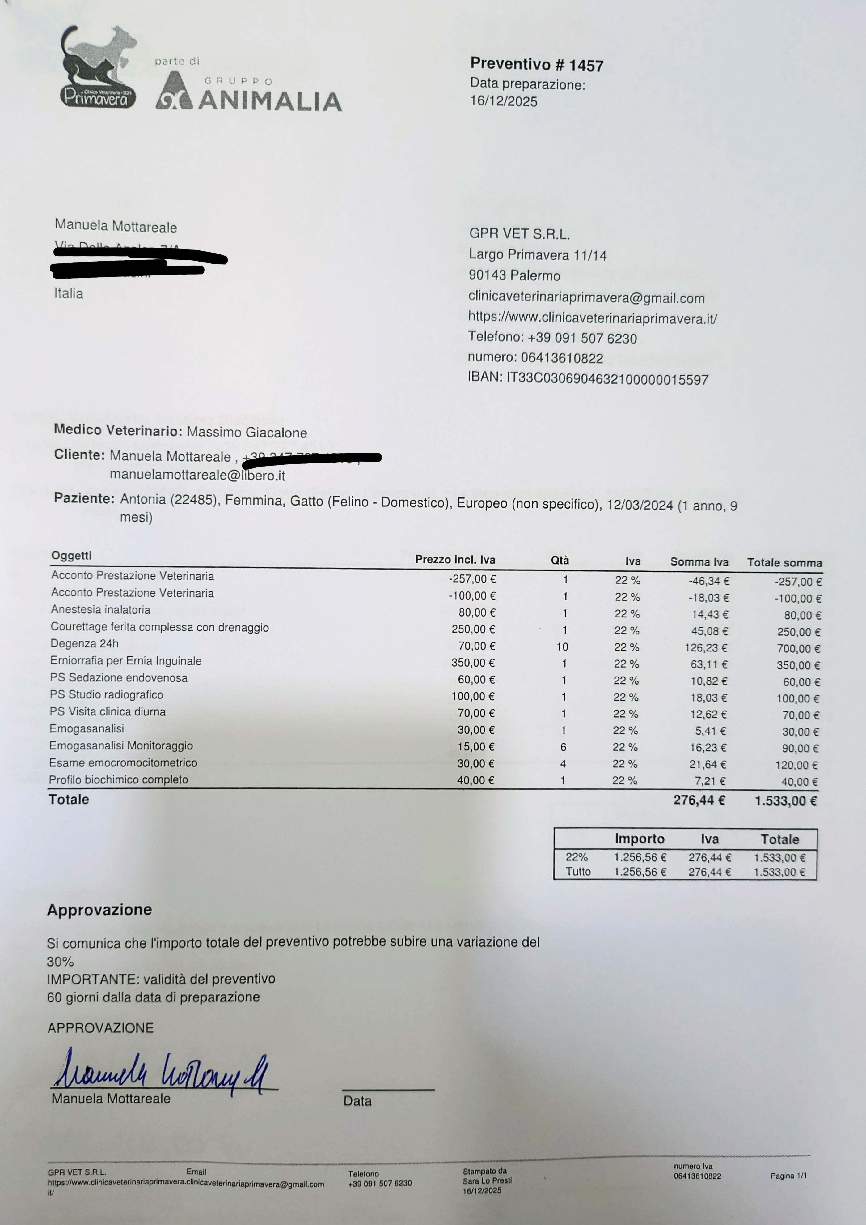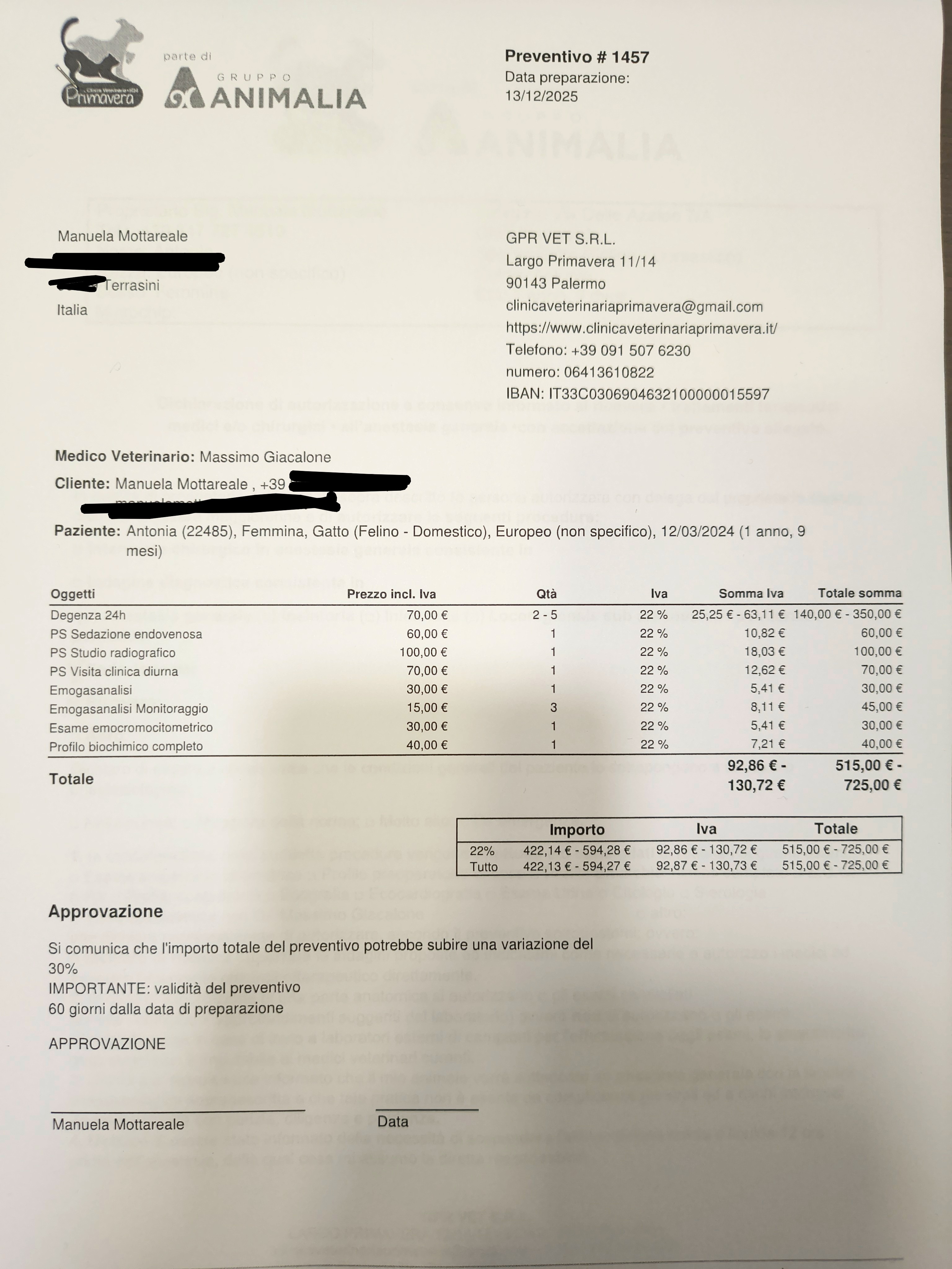 il preventivo iniziale è salito oltre i 1.200€ e potrebbe arrivare a circa 2.000€. Solo l’intervento per l’ernia supera i 300€.