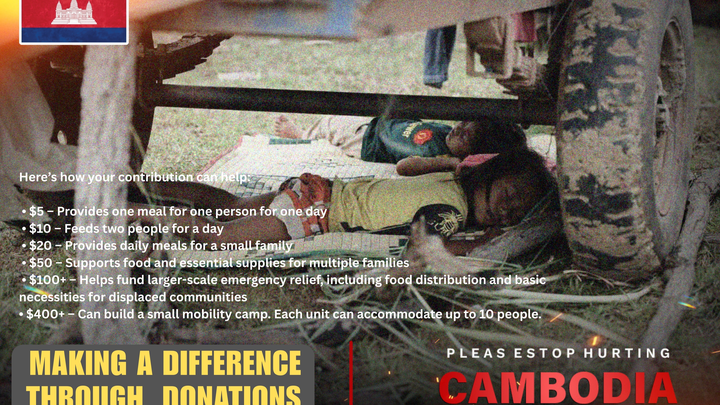 Every donation—no matter the amount—goes directly toward humanitarian support for Cambodian civilians affected by the border conflict, including food, basic necessities, and emergency aid.