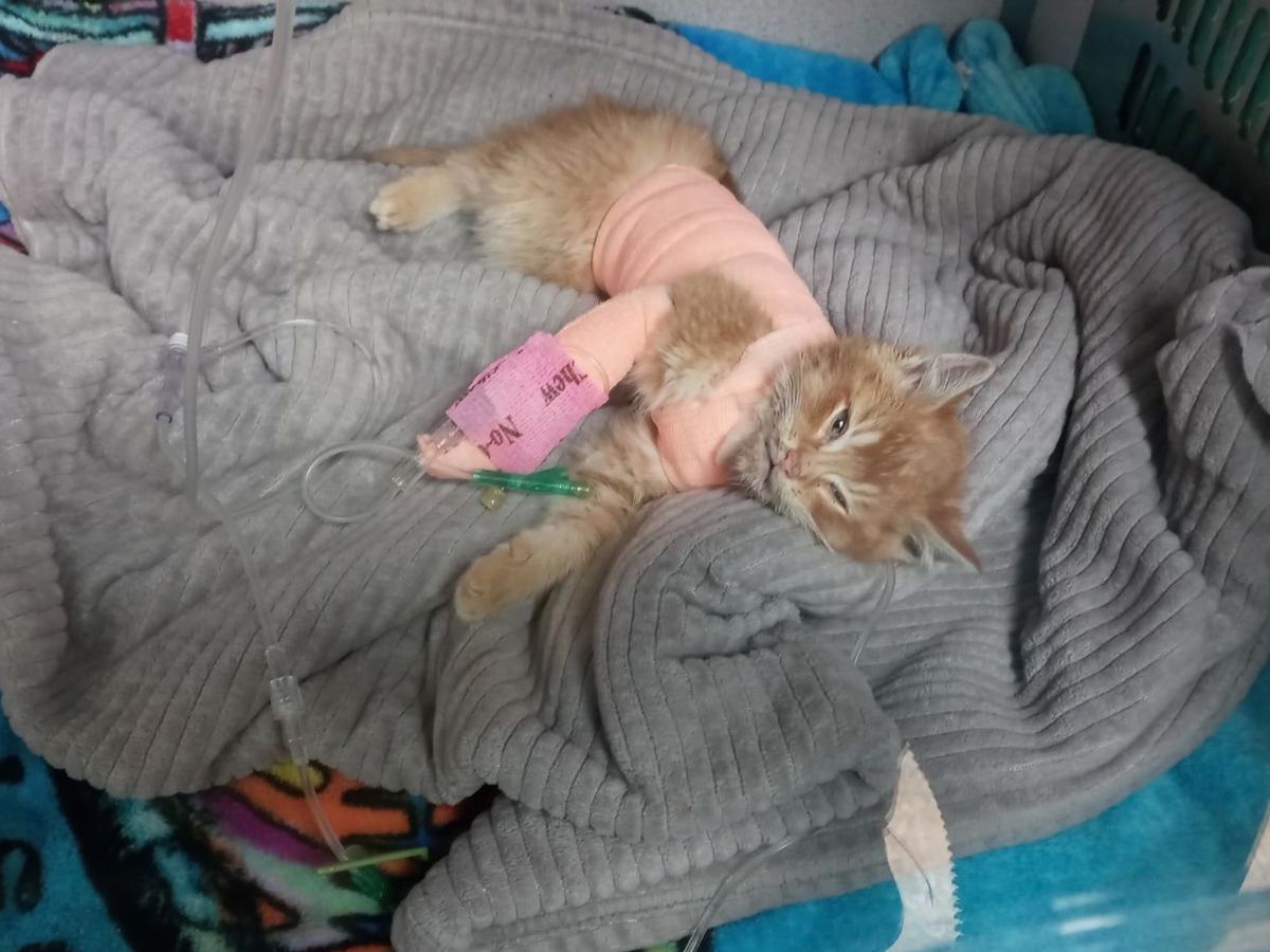 Once he was taken to the vet, they got x-rays and discovered the trauma and how much pain he was in. He had several, severally broken ribs along with having hypothermia, being underweight, being dehydrated, and he was lethargic. Due to his pain and breathing issues, he is in an oxygen chamber. He is also getting nutritional support, intravenous fluids, nebulization, and they’ve wrapped him up for the broken ribs.