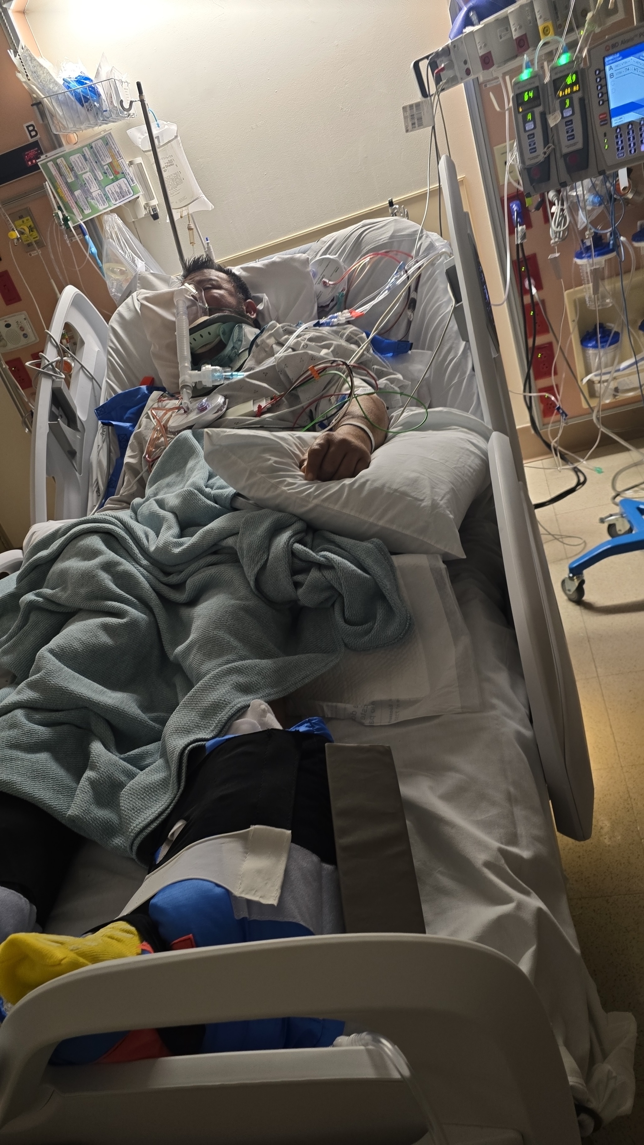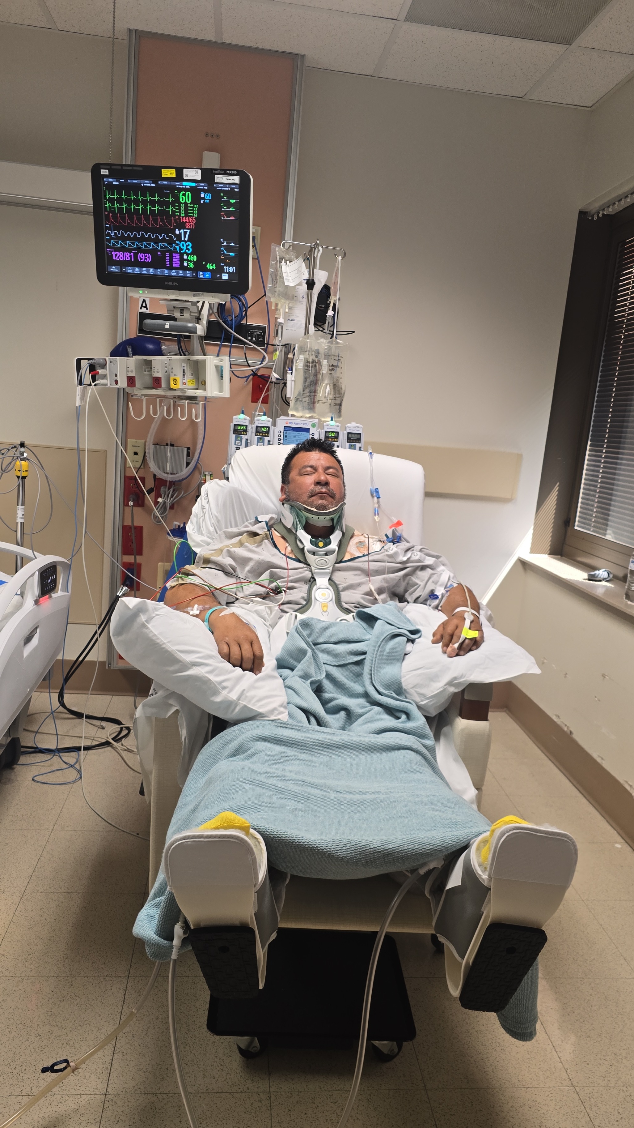 Mi padre fue transportado al Hospital de Rehabilitación de Salud de Encompass, sometido a terapia física intensiva. No tiene ninguna sensación en sus manos y pies en este momento, su camino hacia la recuperación será largo, desafiante y costoso. Posiblemente con una duración de un año o más. Y ahora nos enfrentamos a gastos médicos y de rehabilitación.