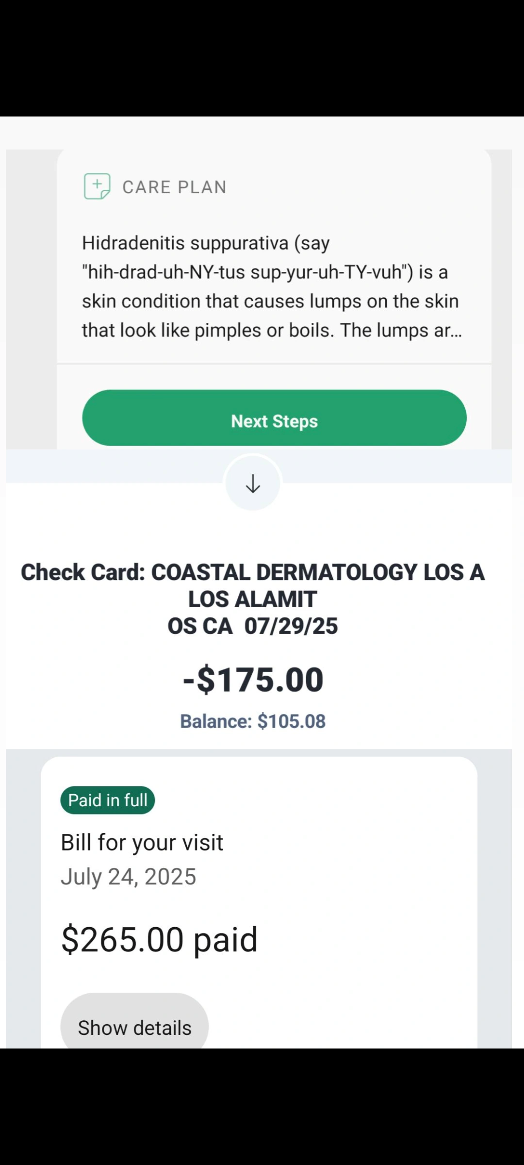 The area turned into multiple painful abscesses last month and were not closing on its own no matter how much I went to an urgent care that accepted my insurance. I couldn't wait anymore for my appointment in October so I made the decision to pay out of pocket on a dermatology urgent care visit and a dermatologist office visit. I lost my job a month before so I had about $300 in my account. I had already spent $440 on only two visits and I am in debt already.