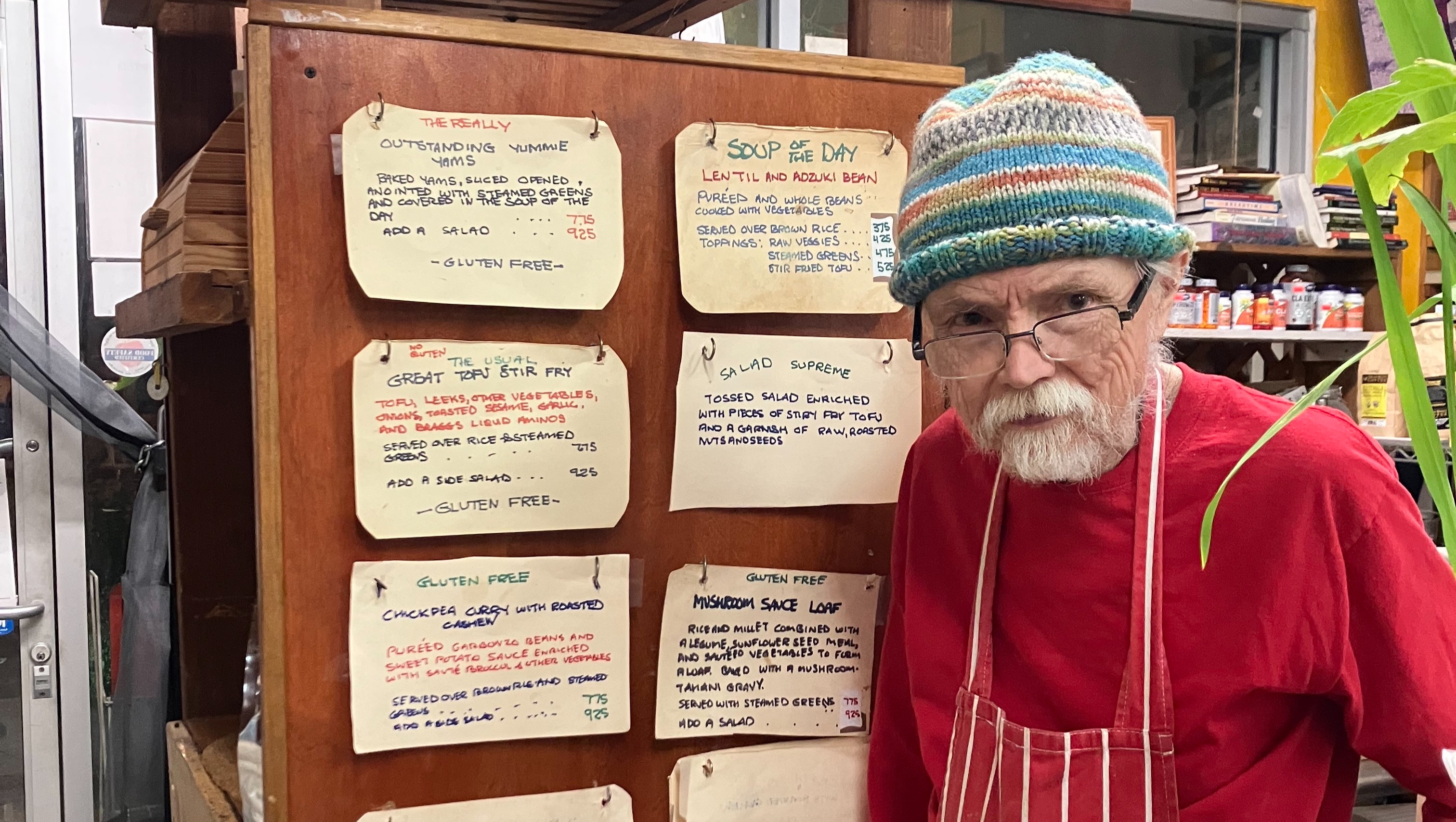 I have known John for about 30 years. No other place had such healthy, wholesome, home-cooked organic vegan food. His meals were so affordable and filling and delicious! He always knew my “usual”… the biggest yam of the bunch, salad with his house mustard dressing, steamed greens, and whatever the soup of the day was. You really couldn’t call it soup. It was always so dense your spoon would stand up in it, which is why he really never needed a bowl, he would just add it to your plate! And the carob nut squares, perfect healthy dessert. The produce in the cooler was always so beautiful because he was very picky in what he would order from his suppliers. It was a funky, hippie dippy little café that was a landmark in the community. And as far as I’m concerned, the best food in town and the only food I wanted to go out to eat. John is such a gentle soul and I always looked forward to giving him a hug. In 2004 and 2008 when I was volunteering for vegan Congressman Dennis Kucinich’s presidential campaign, John generously donated many many meals to Dennis when he was in town campaigning. His adorable old yellow pick up truck that proudly had vegan café written on each side of it, was the mascot of the rear parking lot! He sold vegetable seeds and canned goods and packaged goods and assorted holistic potions by the ounce. Oh Happy Days was one of a kind and I can’t believe it was swept away in a heartbeat. Our community will forever be grateful to John for all his daily backbreaking work keeping his little market and cafe going. The main ingredients of course, were love and commitment to healthy people, a healthy planet and compassion for animals. I am so proud to call John Hopkins my friend.