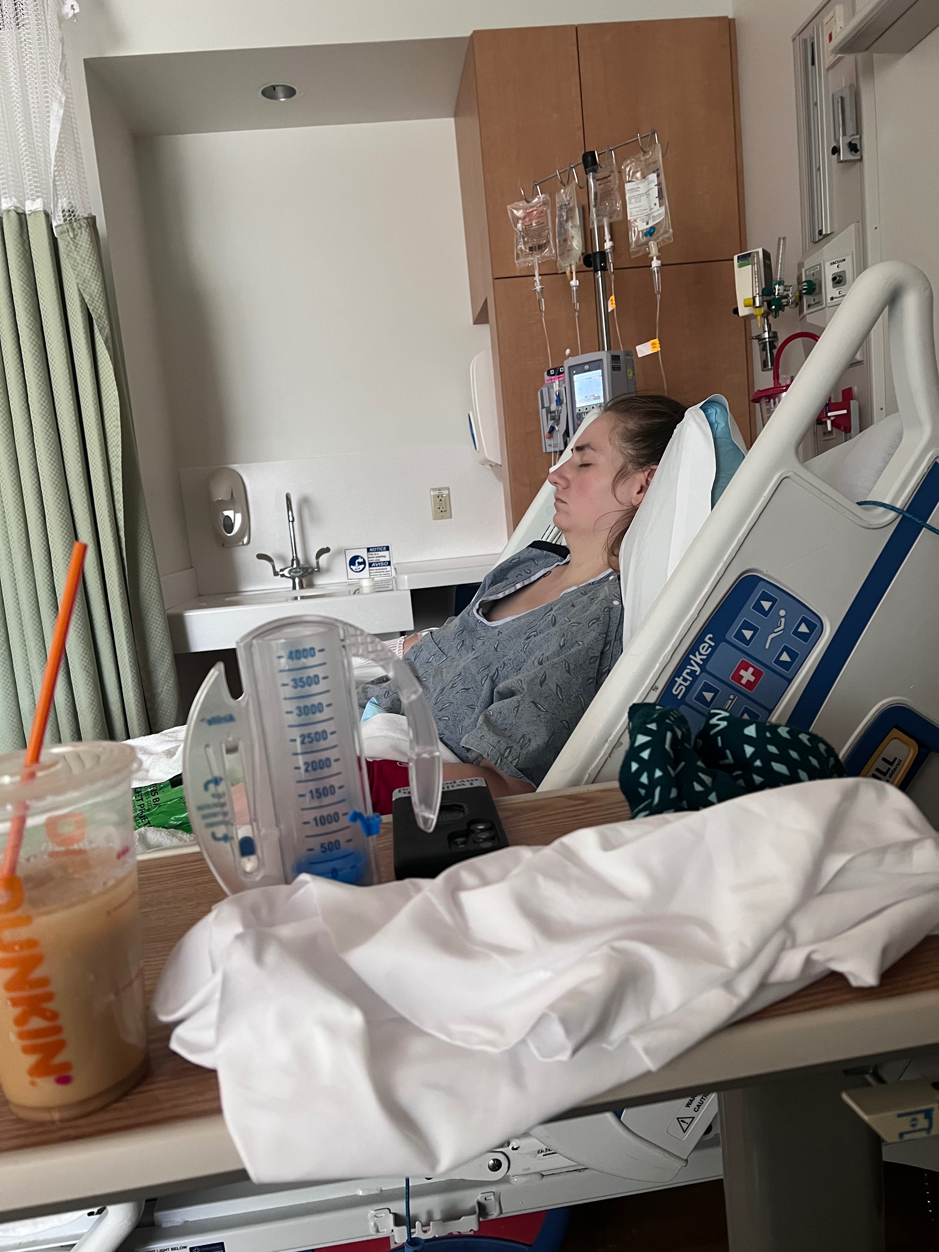 Over the past 6 weeks, Trisha became very sick, running fevers up to 104! In the beginning, she went to a walk-in clinic twice and both times was given antibiotics and sent home. On the last day of the second dose of antibiotics, she came home early (highly unlike her) and her husband promptly brought her to the ER. After having several scans and tests, the on-call OB rushed in, telling her she has a life-threatening pelvic infection and her IUD had migrated. They promptly removed it and admitted her to the hospital. The cultures were not clear on what type of infection Trisha had, so they had to give her an array of antibiotics. Trisha had multiple large pockets of fluid in her tummy, one of which was 10 CM and another was 7 CM in size! They then put drains through her stomach to help drain the infection. At first, it was 2 drains, and then it was 4. The antibiotics were so harsh on her poor veins that they were running out of places to take blood because they were so damaged. So then they decided to put a PICC line in. A PICC line is a more permanent IV that is placed directly into her main artery. Because of the severity of all the damage from numerous IVs, she developed blood clots in her left arm.