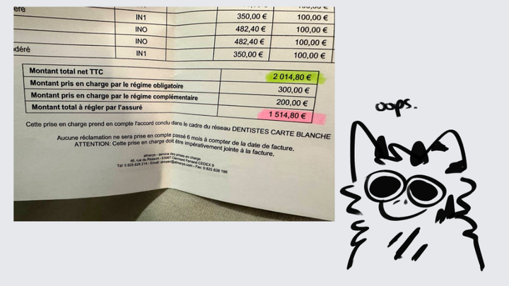 Bonjour, je fais cette cagnotte avec une panique absolue. J'ai des soins dentaire de 1500 euros à couvrir, suite à mon ancien dentistes qui m'a fait un travail de boucher et j'ai énormément souffert, ce qui m'a causé beaucoup plus de complications 1 an plus tard. Ma mutuelle et ma sécurité sociale ne règle que 500 euros sur les frais totaux (2014,80 euros le prix de base.)