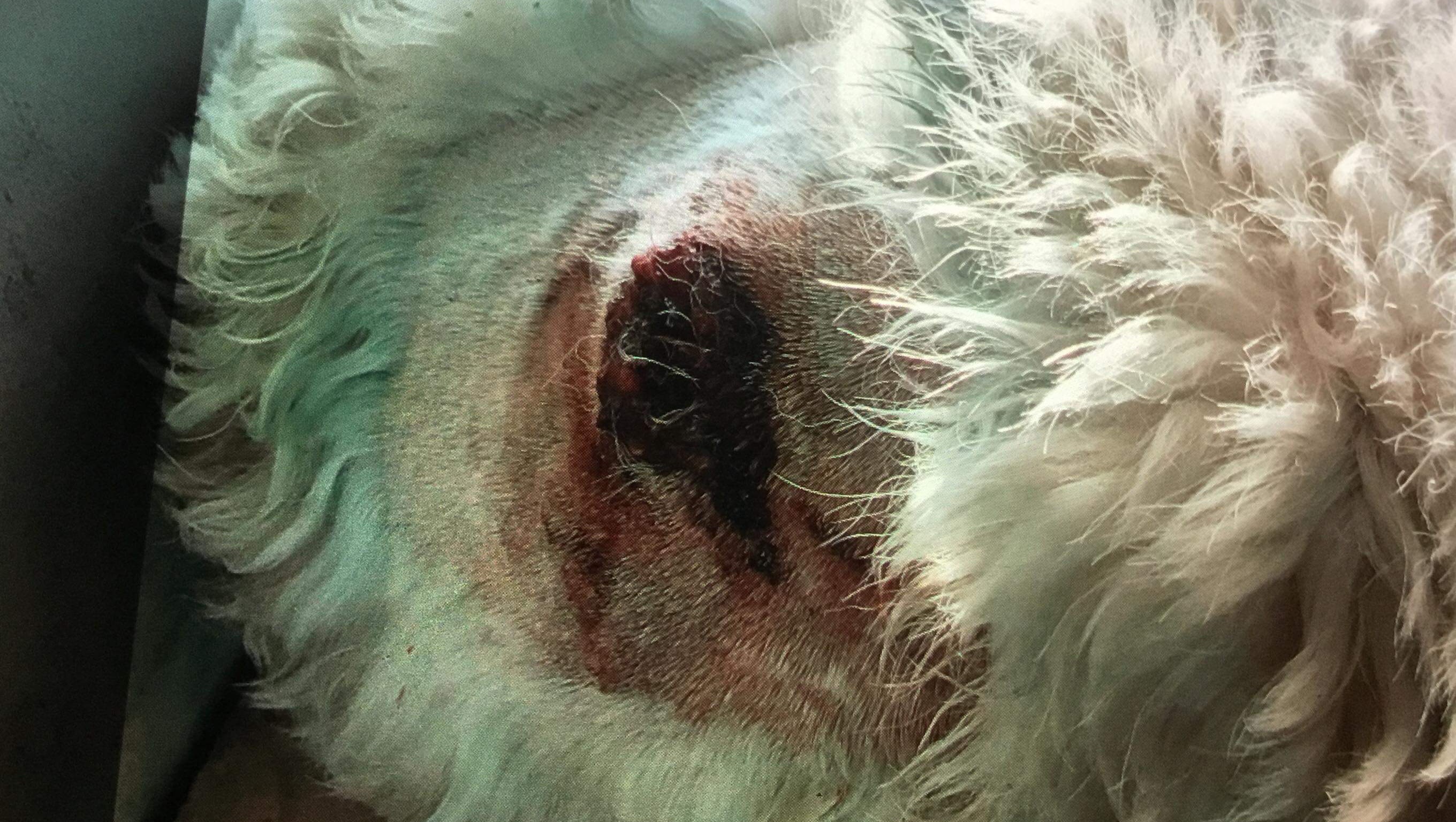Photo taken after Aiden's most recent visit to the Vet, where the tumor on his back was cut, drained, and cleaned.