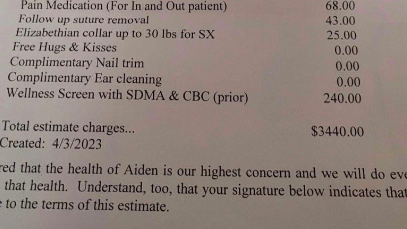 Important to note: Our female dog, Mia, had just suffered through severe Pyometra two months ago, needing emergency surgery which also caused around $3000, and we are still paying it off, which is why we are unable to coordinate a payment plan with Aiden at this time :(