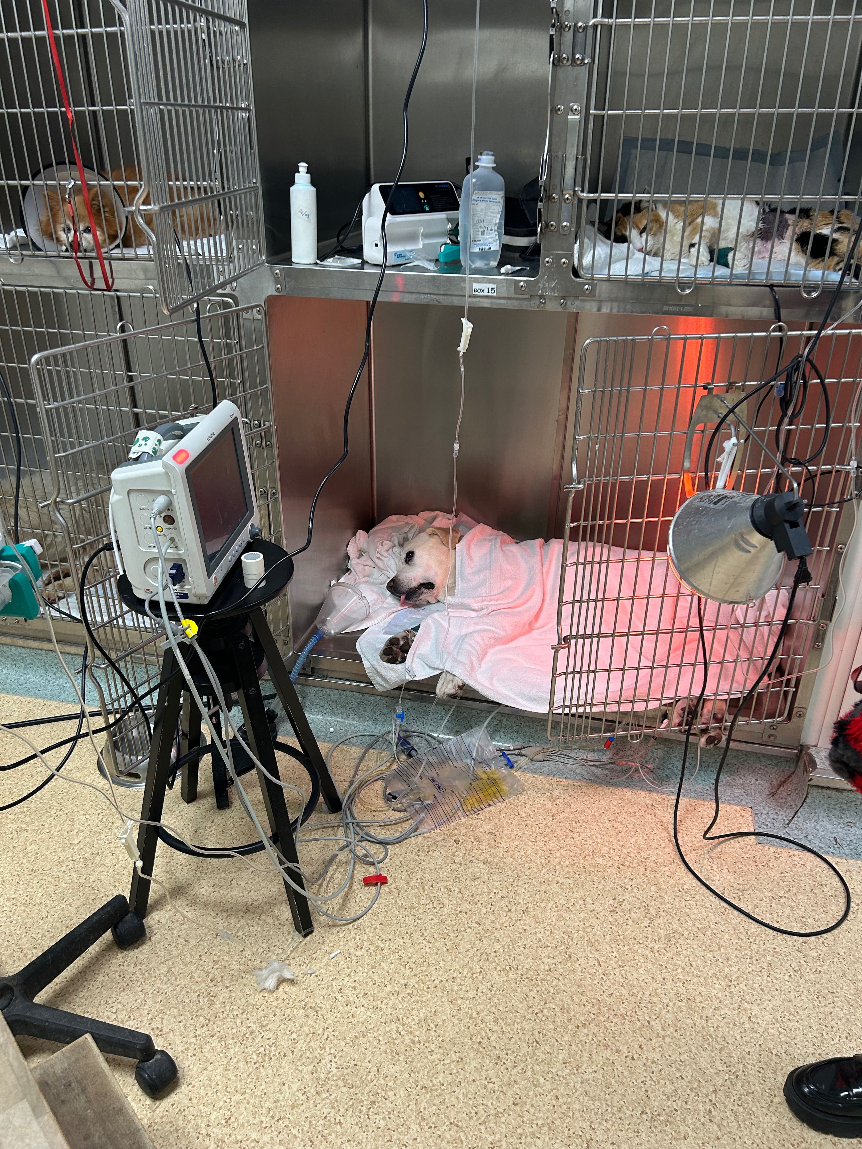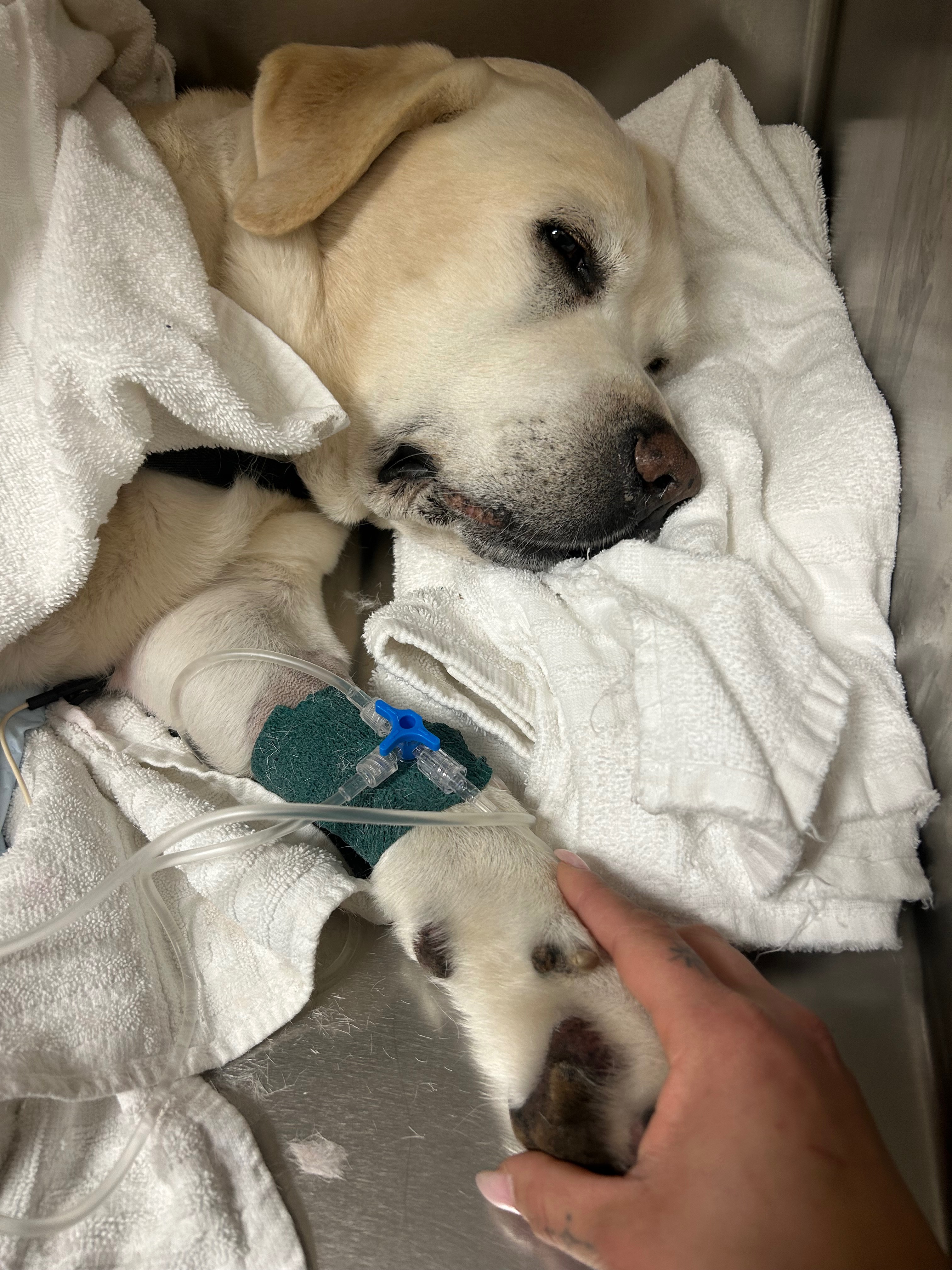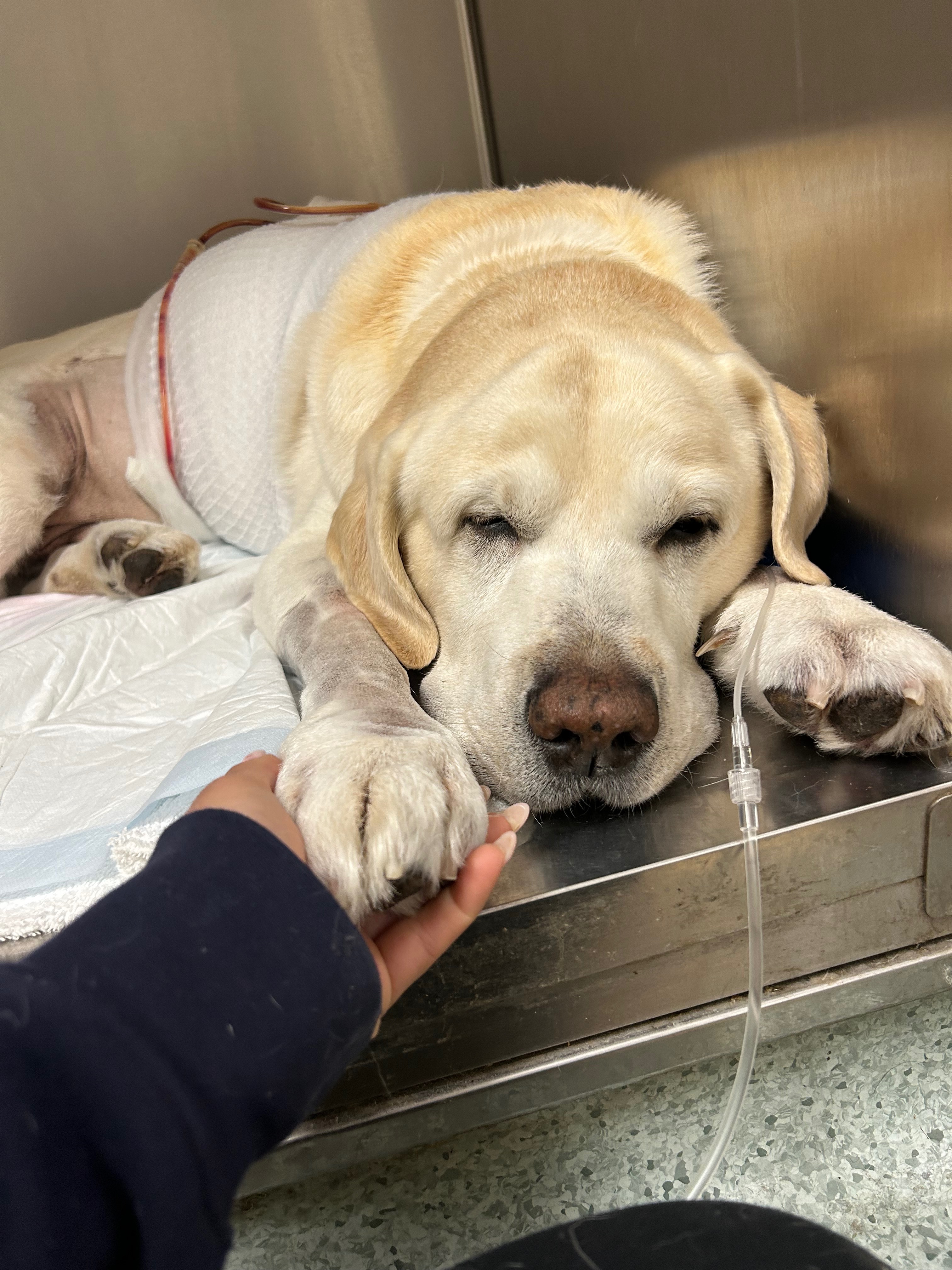 La pancreatite era una conseguenza del versamento di materiale gastrico in addome. Marley si è rivelato una roccia e sta lottando con tutte le sue forze. Ma nel mentre ha necessitato di sangue dea negativo.