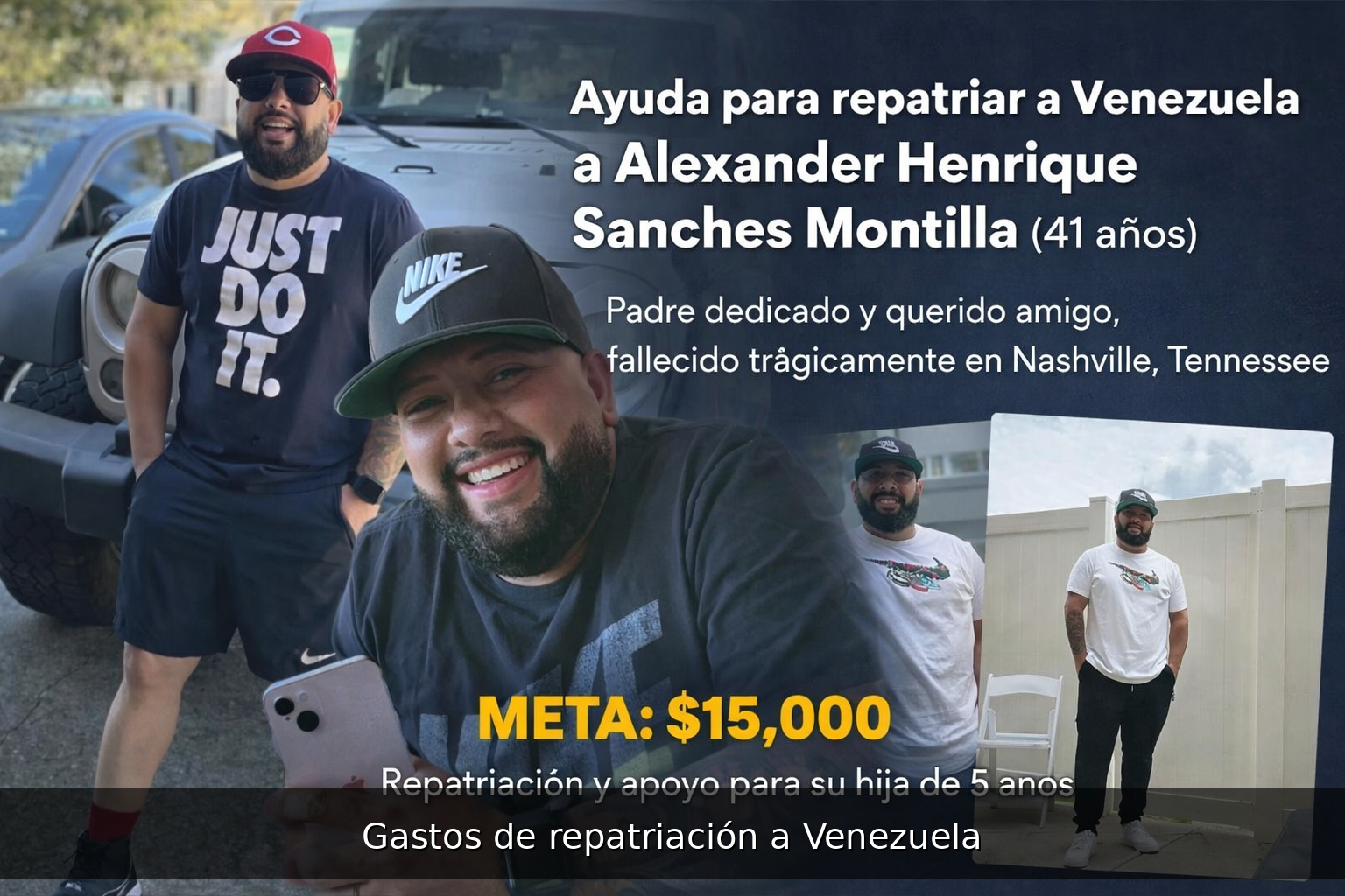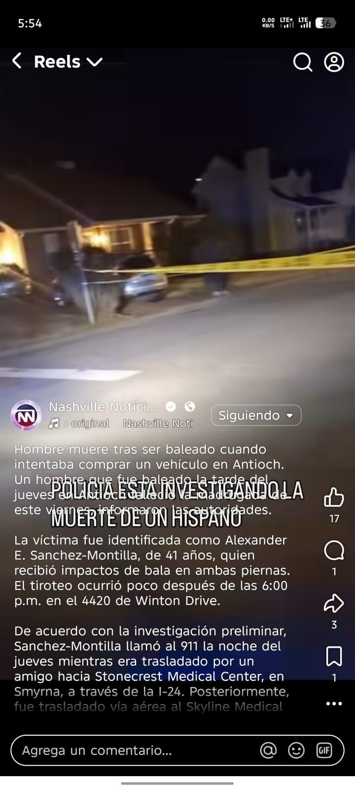 El 13 de febrero de 2026, mi amigo Alexander E. Sanchez‑Montilla, de 41 años, fue víctima de un acto violento con arma de fuego en Nashville mientras intentaba comprar un carro, y tristemente perdió la vida a causa de las heridas. Él mismo llamó al 911 y fue llevado a hospitales, pero no logró sobrevivir.