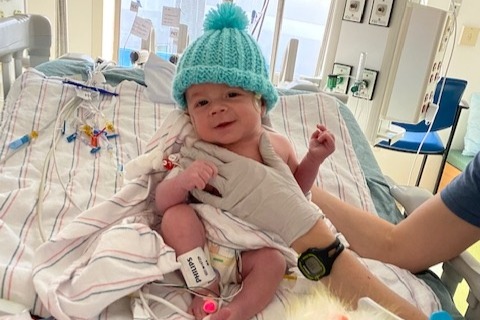 He is now on full time feeds. He is getting what is called PN “parental nutrition” which is a mix of nutrients, fats and vitamins to support his healthy growth. He also has an ostomy to collect his stool because what is left his intestine will need to be reconnected in the future with another surgery once his tiny body is repaired well enough to reconnect it to his colon.