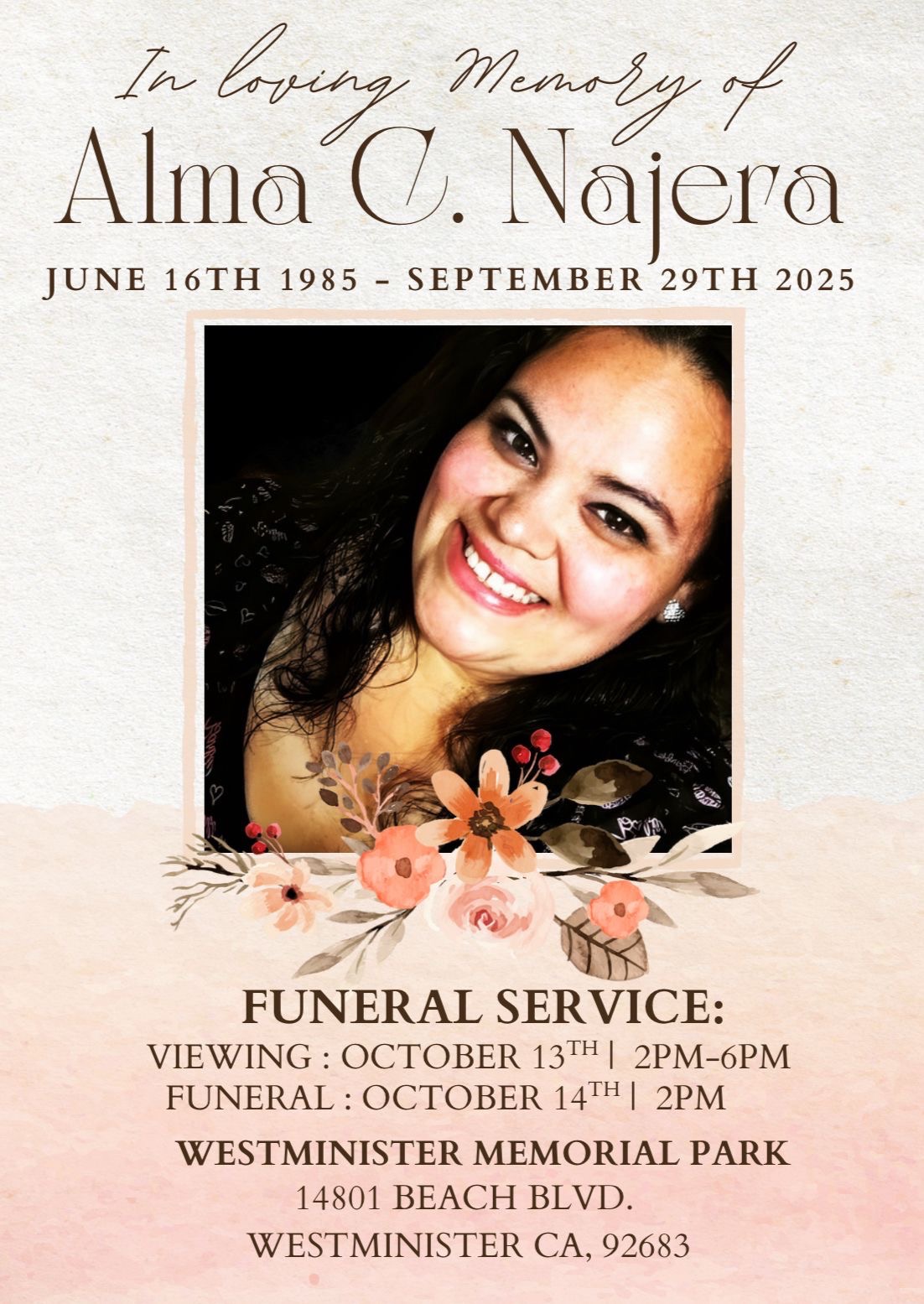 Por medio de la presente, la familia Nájera Rodarte se dirige a ustedes con el corazón lleno de tristeza, debido al sensible fallecimiento de nuestra querida Alma Nájera. En estos momentos de profundo dolor, nos vemos en la necesidad de solicitar su apoyo para poder cubrir los gastos fúnebres que esta situación conlleva.