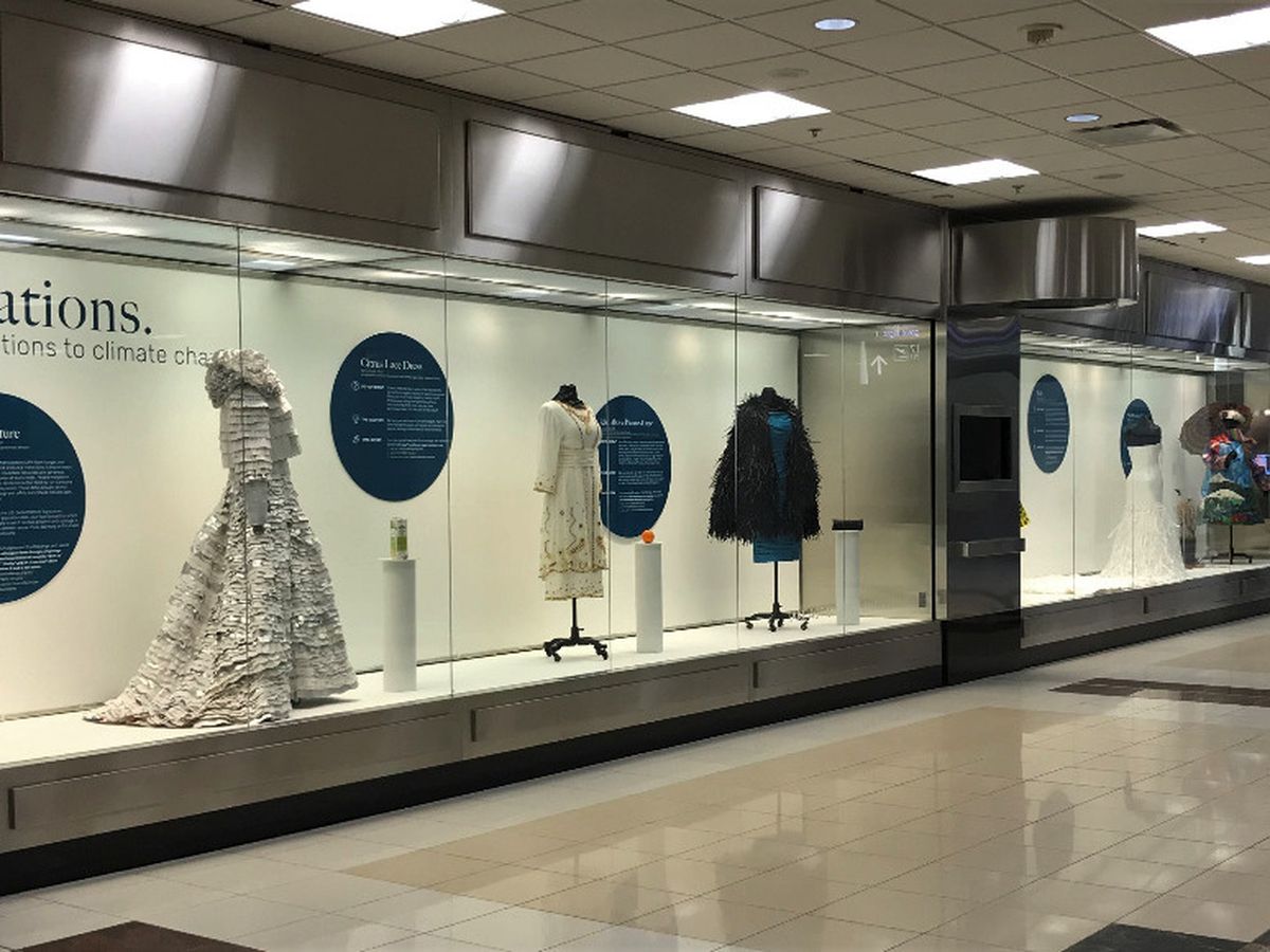 The striking couture sculptures capture the public’s attention; dynamic text panels, educational take-away brochures and two inspiring videos reinforce the exhibition’s message that individual actions can reduce carbon in the atmosphere. A twenty-minute video created by award-winning documentary filmmaker Brady Holden, includes interviews with the artist describing how the sculptures are made and encourages the public to take action through Drawdown Ecochallenges. This video loops 24 hours a day, and will be seen by approximately 11 million people. An additional 60-second video, highlighting the exhibition and Ecochallenges, will play daily on ALL monitors throughout the Airport and be seen by potentially every traveler, 107 million people over the year! Three of the 14 sculptures in the Alternations exhibition