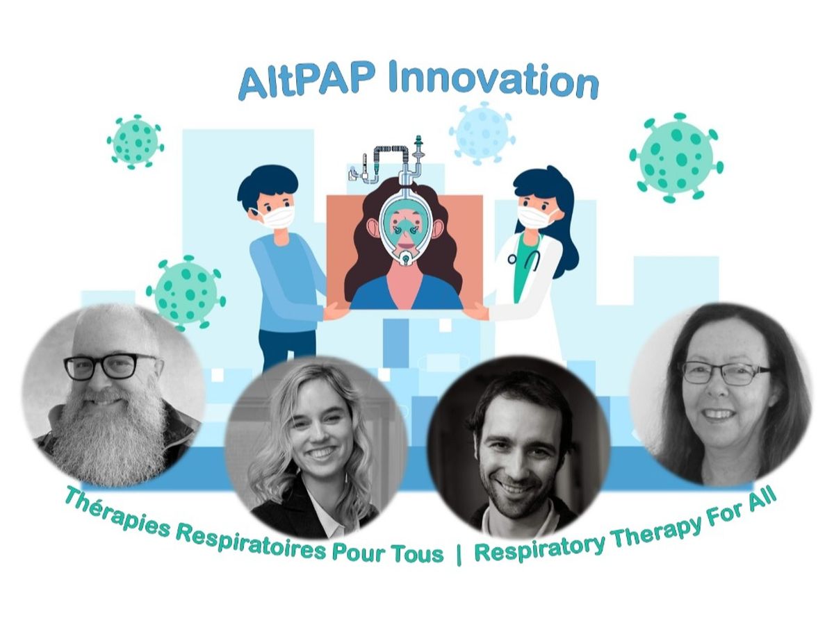 Nous sommes, de droite à gauche sur l'image, une inhalothérapeute et pédagogue (Patrica McClurg), deux chercheurs scientifiques (Sébastien Proulx and Tatiana Ruiz ) et un administrateur collégial à la retraite (Michael Sendbuehler ) et avons fondé AltPAP Innovation afin d'unir nos forces dans la luttes contre la première vague de COVID-19.