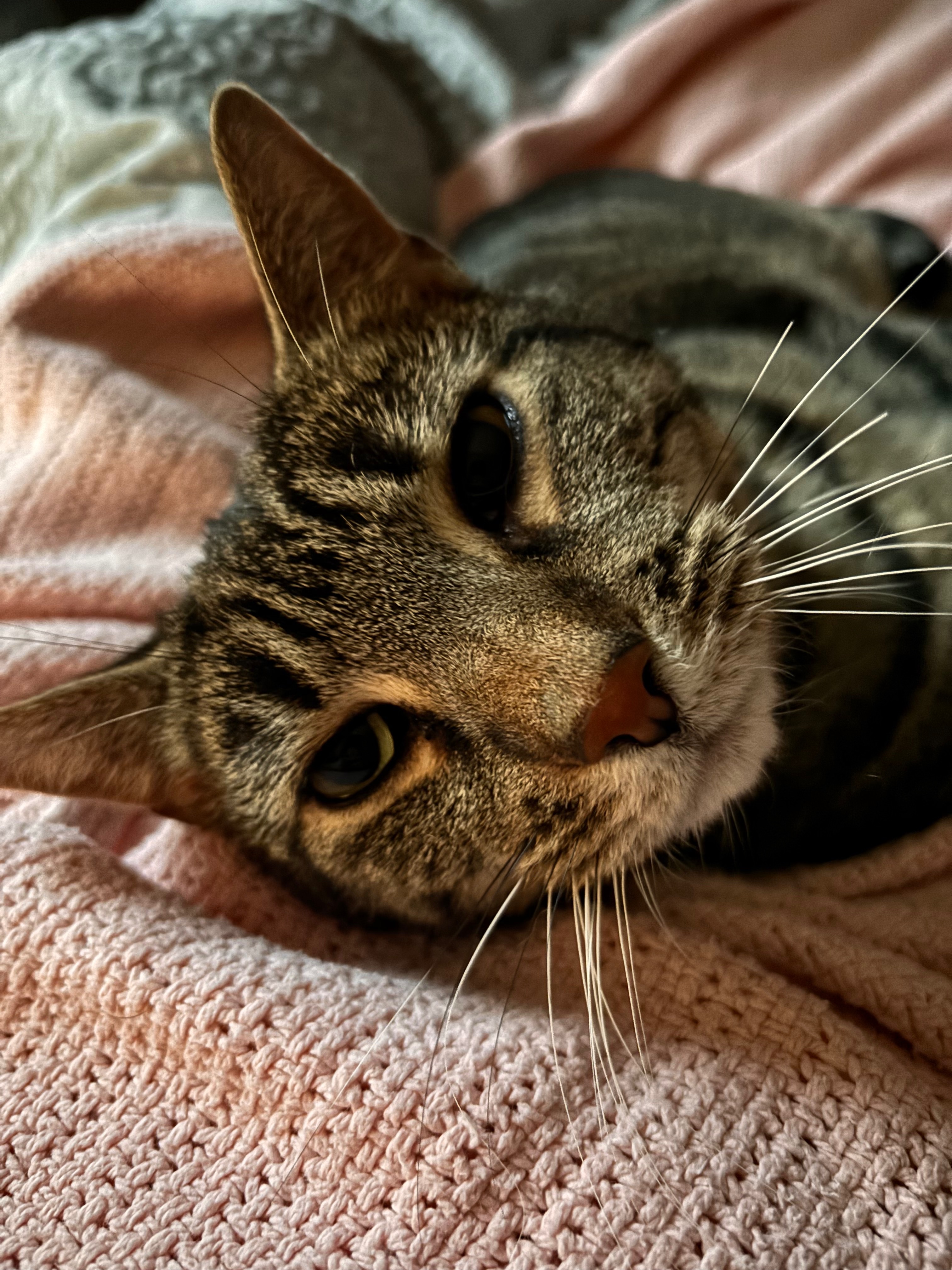 Note from Amber about Kittenbinder (officially Detective Kittenbinder): He came into my life at just the right time. He was a hungry, sweet, but scared little brown tabby kitten half-hidden under a bush. I’d just moved back into my parents home after leaving an abusive marriage. My health was in free fall, and my depression was taking over. The timing was perfect for both of us. We both needed love and care, and he still shows me how much he loves me. He truly takes care of me. On the days that my migraine or chest pain is too high to get out of bed, he sticks right with me, giving me snuggles and emotional support. This little guy is still helping me every single day.