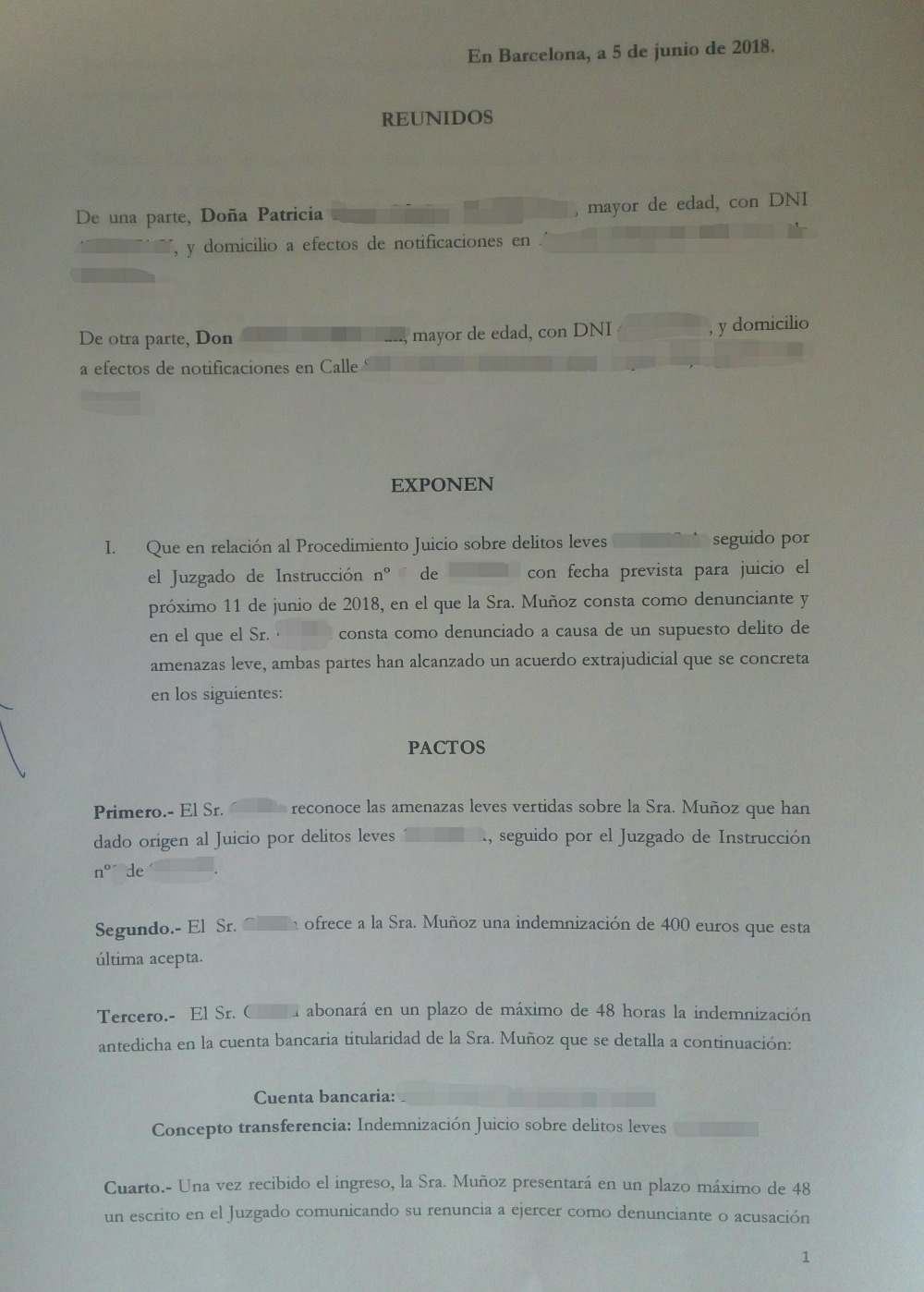 El primer juicio por amenazas telefónicas (delito leve) estaba señalado para el 11 de Junio 2018. Se ha llegado a un acuerdo donde el acusado ha reconocido los hechos, abonando por ello 400 €, una buena cantidad al tratarse en este caso de delito leve, y superior a lo que conllevaría una sentencia estimatoria.