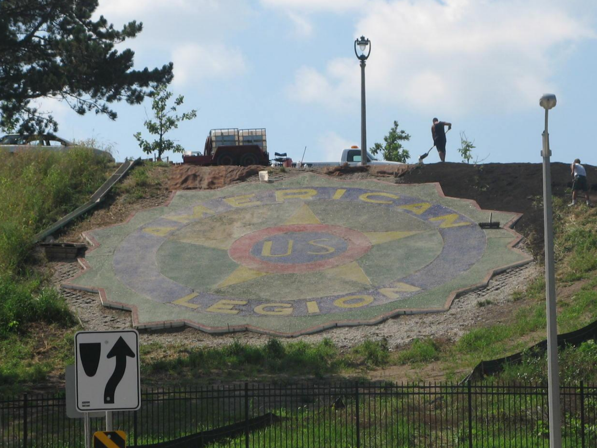 For nearly 15 years, the emblem disappeared. Then, after the Water Works decommissioned the original water reservoir and transformed it into a park in 2006, a permanent representation of the American Legion Emblem was installed in 2010. The new monument used polished glass instead of flowers to create a representation of the emblem. Sadly, after just 12 years, the polished glass is deteriorating and in need of repair.