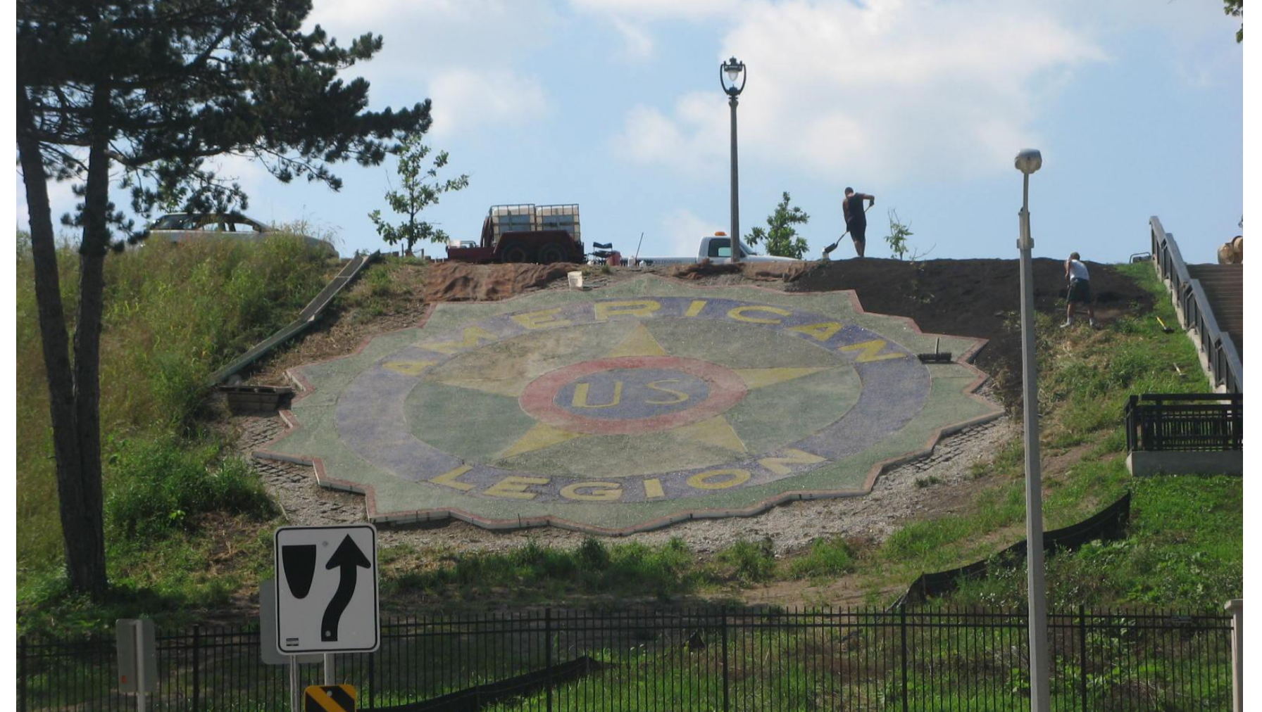 For nearly 15 years, the emblem disappeared. Then, after the Water Works decommissioned the original water reservoir and transformed it into a park in 2006, a permanent representation of the American Legion Emblem was installed in 2010. The new monument used polished glass instead of flowers to create a representation of the emblem. Sadly, after just 12 years, the polished glass is deteriorating and in need of repair.