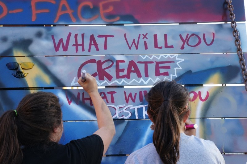 In each community I visit, differences were aired and opinions written across the flag transforming it into a weathered and weary example of our national disposition, visualizing the dynamic relationship between freedom and tolerance.  The flag, now beleaguered, exemplifies the strain on our collective patience and respect for one another, but this is not the end of the art experience.  American Expressions fosters a great redemptive event when the flag is restored to its red, white, and blue glory.  Bringing people together to paint the flag is the most powerful embodiment of the American experiment.  It is an exercise that bonds us by working together despite our differences in pursuit of that high ideal, a more perfect union.
