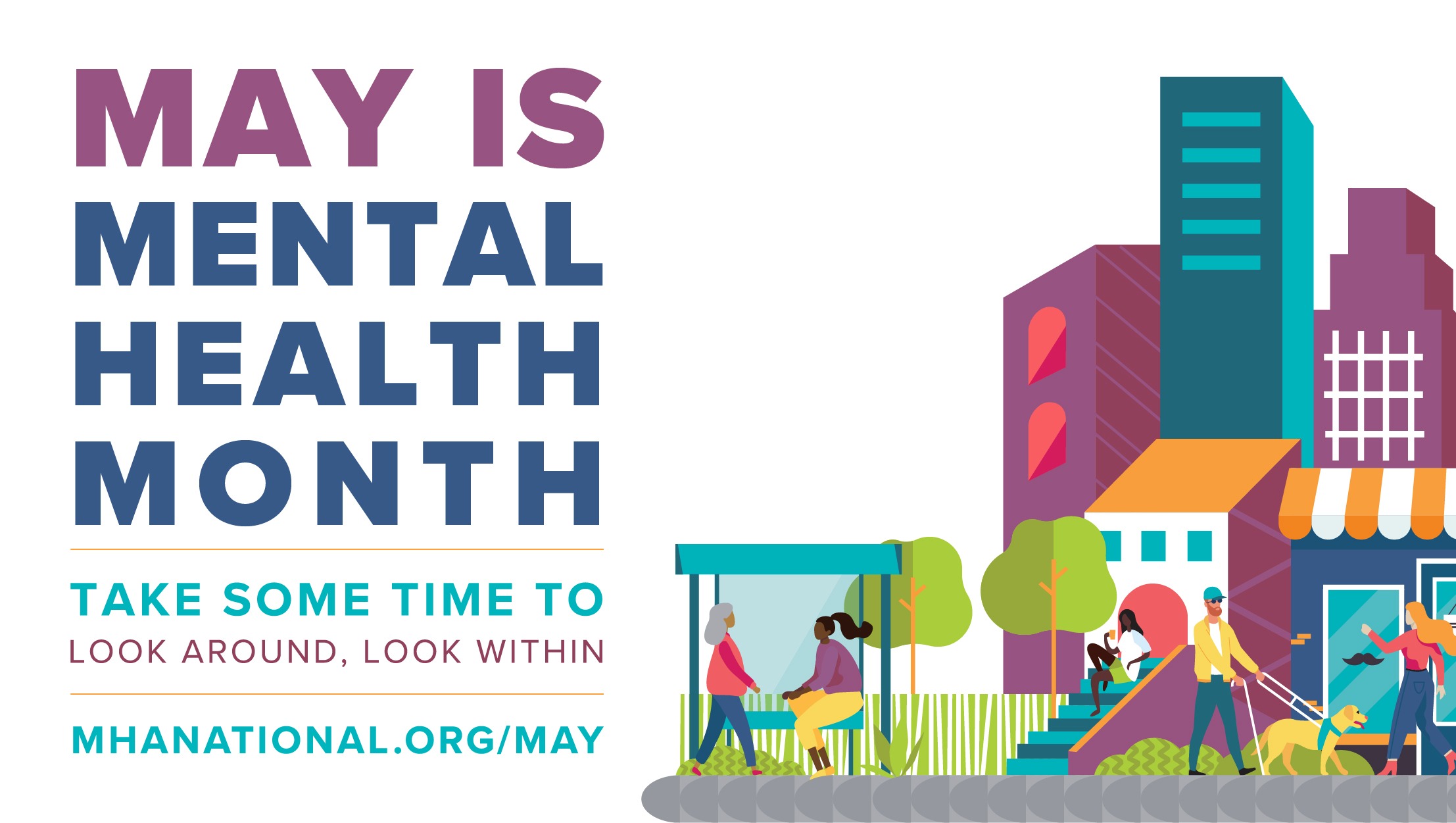 Image description: May is Mental Health Month. Take some time to look around, look within. MHANational.org/May